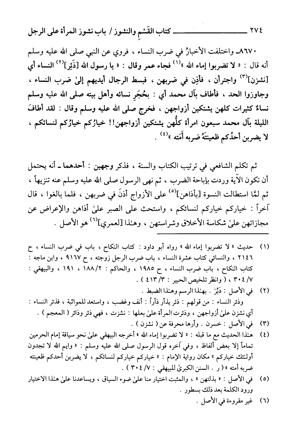 (1) حديث " لا تضربوا إماء الله " رواه أبو داود: كتاب النكاح، باب في ضرب النساء، ح 2146، والنسائي كتاب عشرة النساء، باب ضرب الرجل زوجته، ح 9167، وابن ماجه: كتاب النكاح، باب ضرب النساء، ح 1985، والحاكم: 2/ 188، 191، والبيهقي: 7/ 354، (وانظر تلخيص الحبير: 3/ 413).