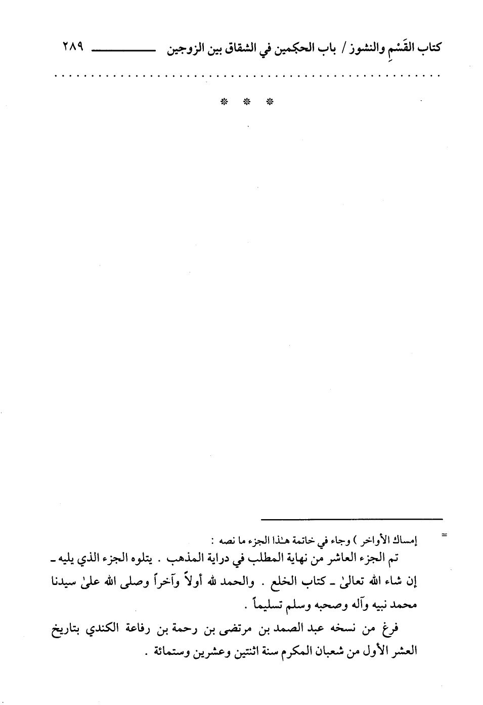 تم الجزء العاشر من نهاية المطلب في دراية المذهب. يتلوه الجزء الذي يليه -إن شاء الله تعالى- كتاب الخلع. والحمد لله أولاً وآخراً وصلى الله على سيدنا محمد نبيه وآله وصحبه وسلم تسليماً.
