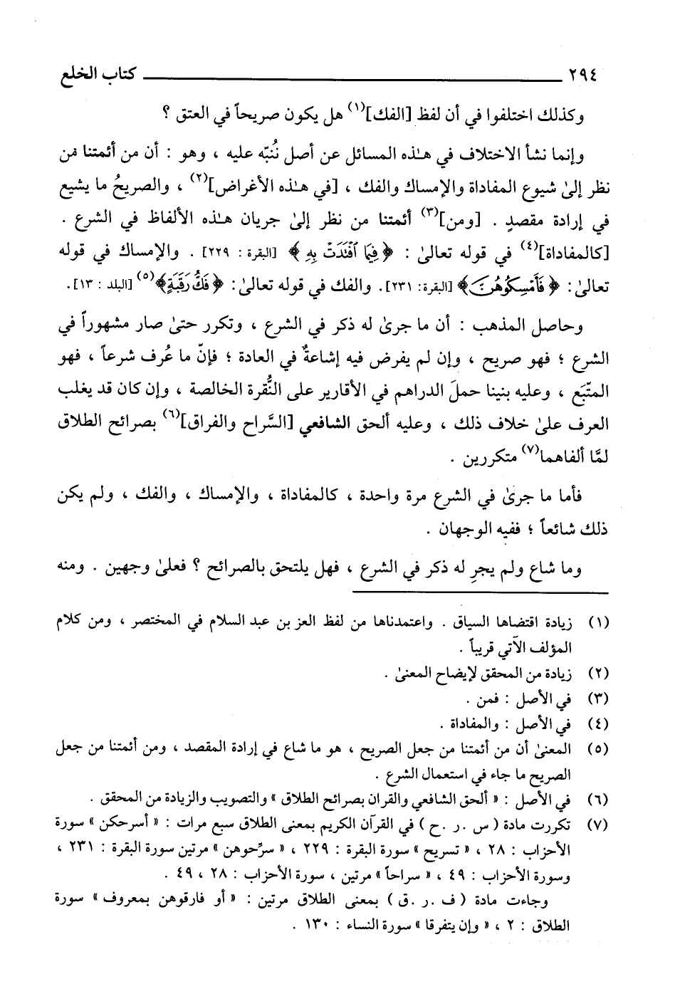 (7) تكررت مادة (س. ر. ح) في القرآن الكريم بمعنى الطلاق سبع مرات: "أسرحكن" سورة الأحزاب: 28، "تسريح" سورة البقرة: 229، "سرِّحوهن" مرتين سورة البقرة: 231، وسورة الأحزاب: 49، "سراحاً" مرتين، سورة الأحزاب: 28، 49.