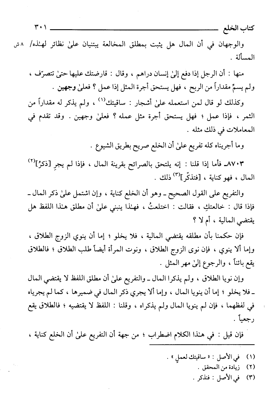 8703 - فأما إذا قلنا: إنه يلتحق بالصرائح بقرينة المال، فإذا لم يجرِ [ذكرُ] (2) المال، فهو كناية، [فتذكّر] (3) ذلك.