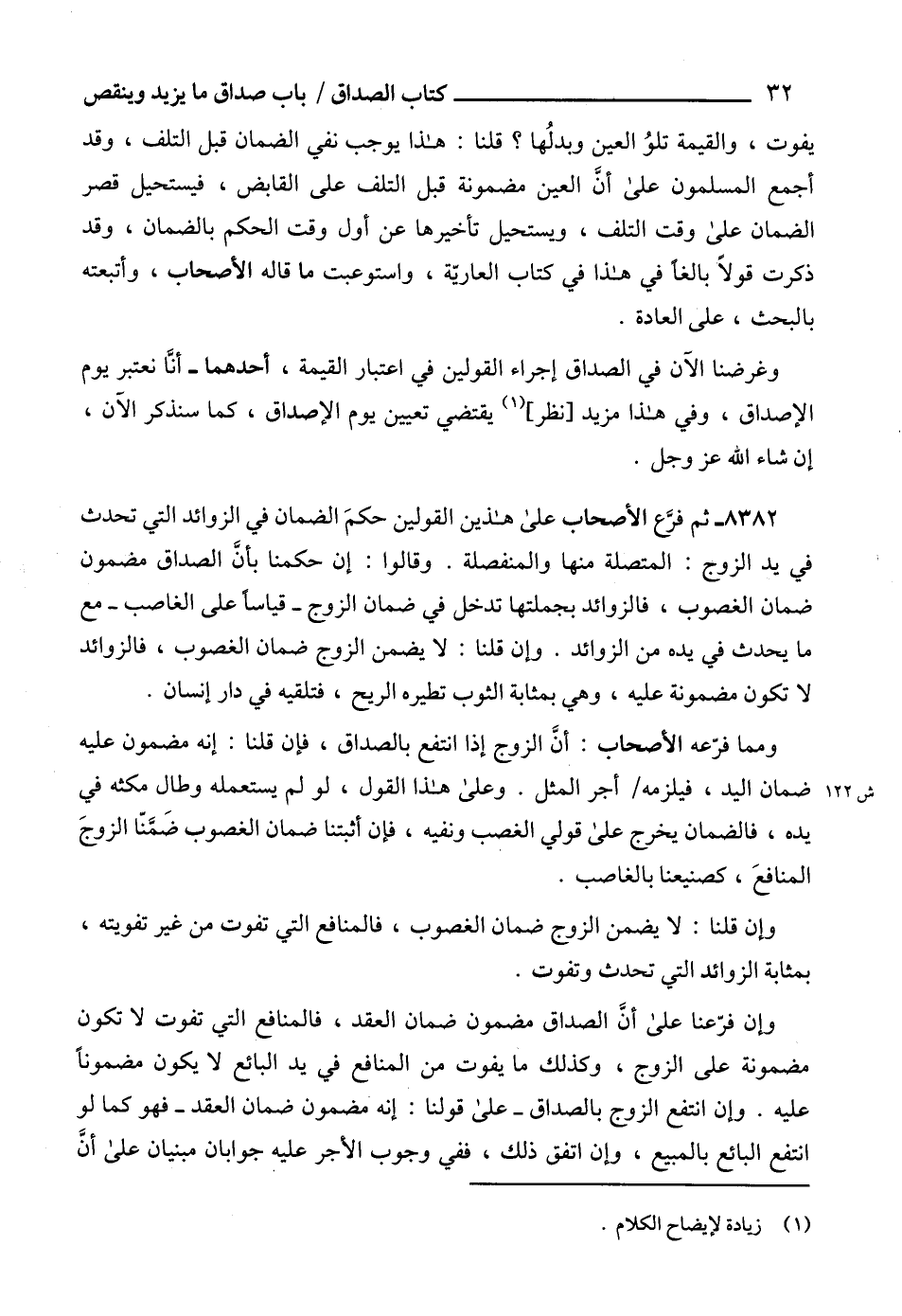 8382 - ثم فرَّع الأصحاب على هذين القولين حكمَ الضمان في الزوائد التي تحدث في يد الزوج: المتصلة منها والمنفصلة. وقالوا: إن حكمنا بأنَّ الصداق مضمون ضمان الغصوب، فالزوائد بجملتها تدخل في ضمان الزوج -قياساً على الغاصب- مع ما يحدث في يده من الزوائد. وإن قلنا: لا يضمن الزوج ضمان الغصوب، فالزوائد لا تكون مضمونة عليه، وهي بمثابة الثوب تطيره الريح، فتلقيه في دار إنسان.