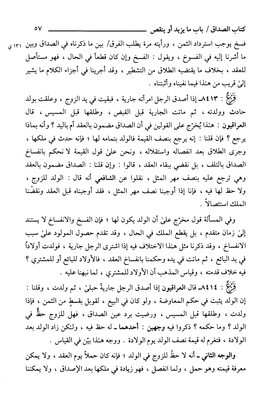 8414 - قال العراقيون إذا أصدق الرجل جاريةً حبلى، ثم ولدت، وقلنا: إن الولد يثبت في حكم المعاوضة، ولو كان في البيع، لقوبل بقسط من الثمن، فإذا ولدت، وطلقها قبل المسيس، ورضيت برد عين الصداق، فهل للزوج حظُّ في الولد؟ وما حكمه؟ ذكروا فيه وجهين: أحدهما - له حظ فيه، ولكن زاد الولد بعد الولادة، فتغرم له قيمة نصف الولد يوم الولادة. ووجه هذا بيّن في القياس.