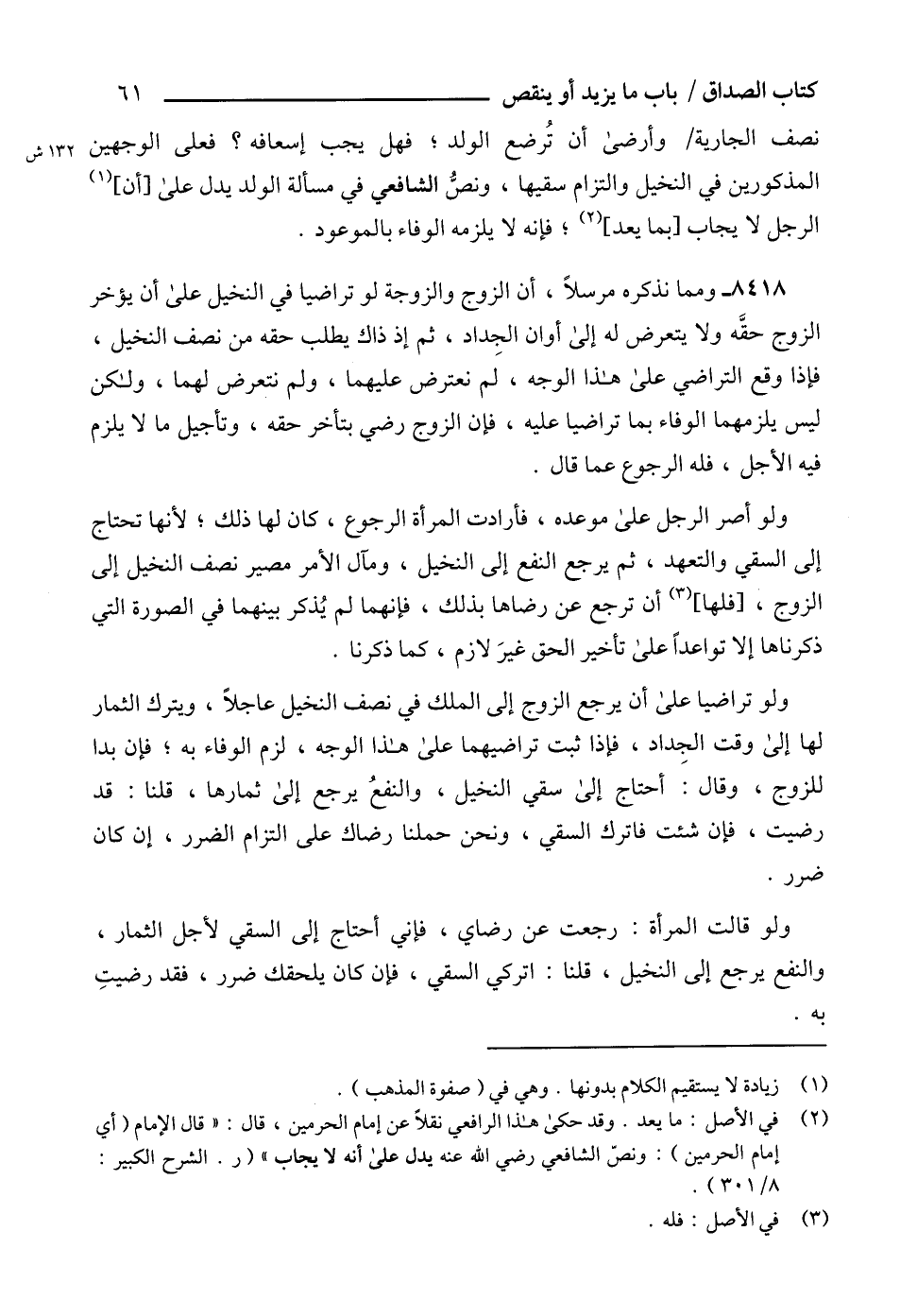 8418 - ومما نذكره مرسلاً، أن الزوج والزوجة لو تراضيا في النخيل على أن يؤخر الزوج حقَّه ولا يتعرض له إلى أوان الجِداد، ثم إذ ذاك يطلب حقه من نصف النخيل، فإذا وقع التراضي على هذا الوجه، لم نعترض عليهما، ولم نتعرض لهما، ولكن ليس يلزمهما الوفاء بما تراضيا عليه، فإن الزوج رضي بتأخر حقه، وتأجيل ما لا يلزم فيه الأجل، فله الرجوع عما قال.