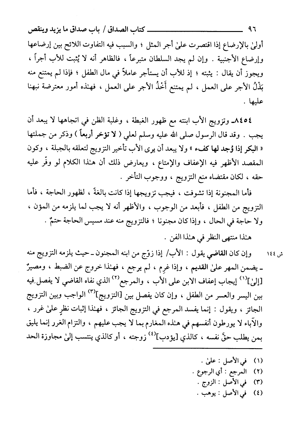 8454 - وتزويج الأب ابنته مع ظهور الغبطة، وغلبة الظن في اتجاهها لا يبعد أن يجب. وقد قال الرسول صلى الله عليه وسلم لعلي (لا تؤخر أربعاً) وذكر من جملتها " البكر إذا وُجد لها كفء " ولا يبعد أن يرى الأب تأخير التزويج لتعلقه بالجبلة، وكون المقصد الأظهر فيه الإعفاف والإمتاع، ويعارض ذلك أن هذا الكلام لو وفّر عليه حقه، لكان مقتضاه منع التزويج، ووجوب التأخر.