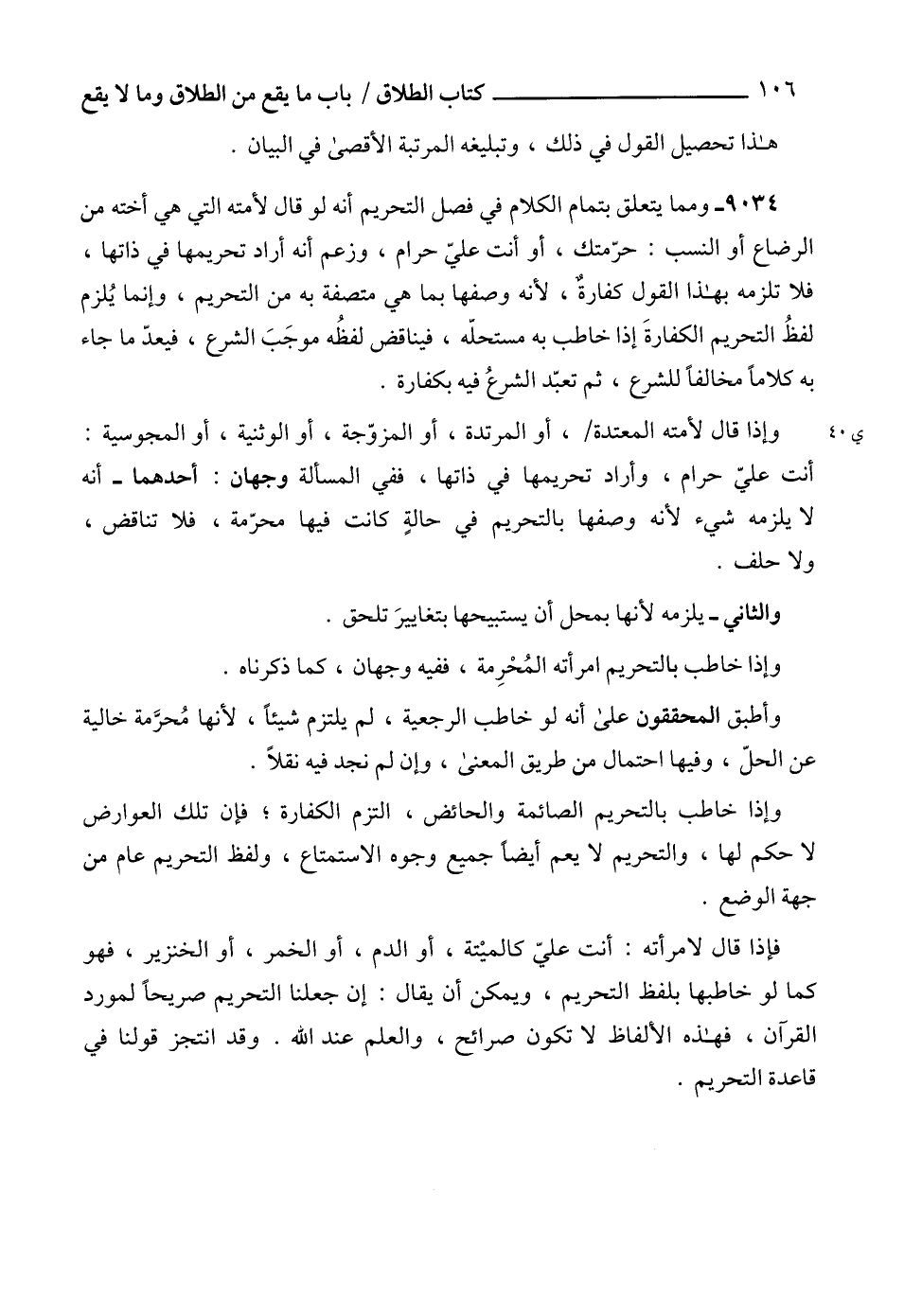 9034 - ومما يتعلق بتمام الكلام في فصل التحريم أنه لو قال لأمته التي هي أخته من الرضاع أو النسب: حرّمتك، أو أنت عليّ حرام، وزعم أنه أراد تحريمها في ذاتها، فلا تلزمه بهذا القول كفارةٌ، لأنه وصفها بما هي متصفة به من التحريم، وإنما يُلزم لفظُ التحريم الكفارةَ إذا خاطب به مستحلّه، فيناقض لفظُه موجَبَ الشرع، فيعدّ ما جاء به كلاماً مخالفاً للشرع، ثم تعبّد الشرعُ فيه بكفارة.