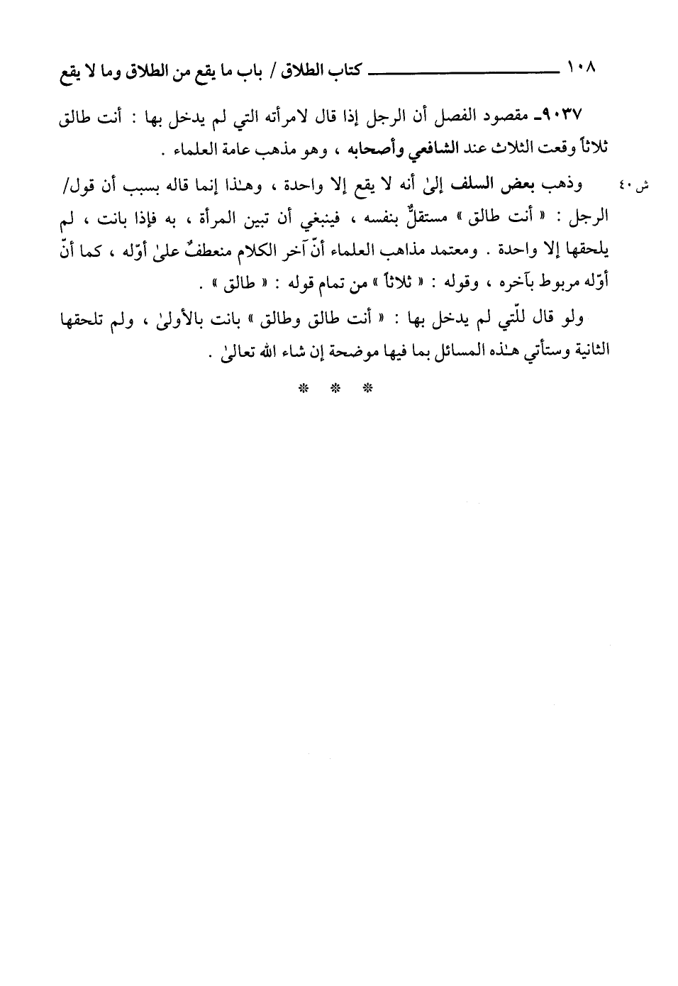 9037 - مقصود الفصل أن الرجل إذا قال لامرأته التي لم يدخل بها: أنت طالق ثلاثاً وقعت الثلاث عند الشافعي وأصحابه، وهو مذهب عامة العلماء.