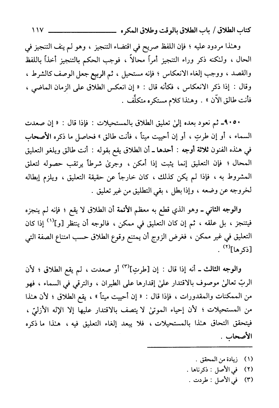والوجه الثالث - أنه إذا قال: إن [طرتِ] (3) أو صعدت، لم يقع الطلاق، لأن الربّ تعالى موصوف بالاقتدار على إقدارها على الطيران، والترقي في السماء، فهو من الممكنات والمقدورات، فإذا قال: "إن أحييت ميتاً"، يقع الطلاق؛ لأن هذا من المستحيلات؛ لأن إحياء الموتى لا يتصف بالاقتدار عليها إلا الإله الأزليّ، فيتحقق التحاق هذا بالمستحيلات، فلا يبعد إلغاء التعليق فيه، هذا ما ذكره الأصحاب.