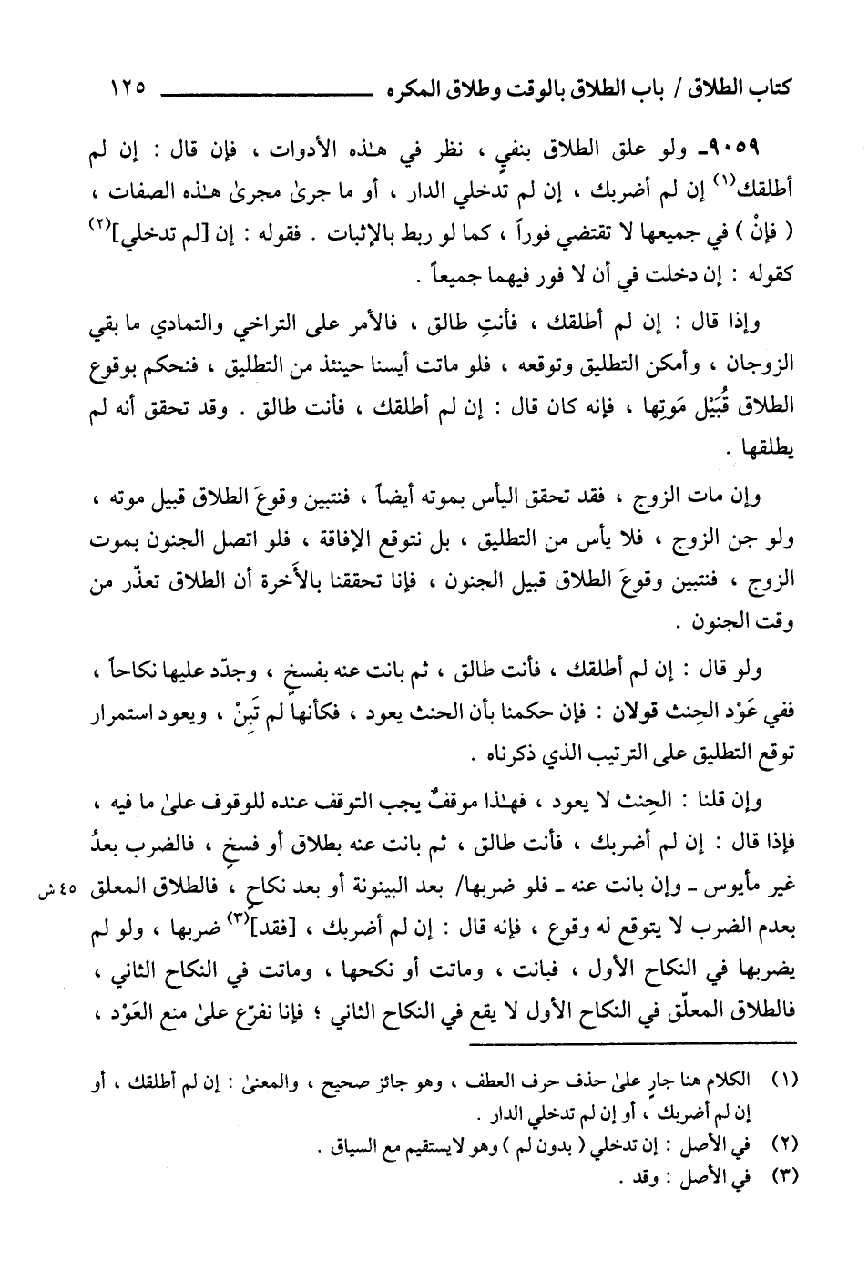 9059 - ولو علق الطلاق بنفيٍ، نظر في هذه الأدوات، فإن قال: إن لم أطلقك (1) إن لم أضربك، إن لم تدخلي الدار، أو ما جرى مجرى هذه الصفات، (فإنْ) في جميعها لا تقتضي فوراً، كما لو ربط بالإثبات. فقوله: إن [لم تدخلي] (2) كقوله: إن دخلت في أن لا فور فيهما جميعاًً.