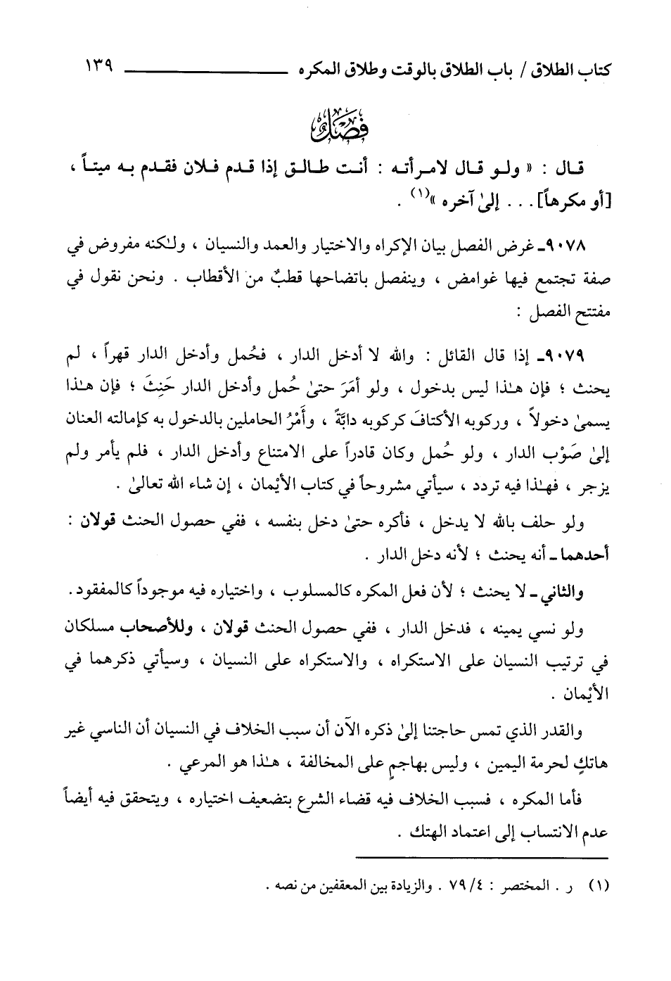 9078 - غرض الفصل بيان الإكراه والاختيار والعمد والنسيان، ولكنه مفروض في صفة تجتمع فيها غوامض، وينفصل باتضاحها قطبٌ من الأقطاب. ونحن نقول في مفتتح الفصل: