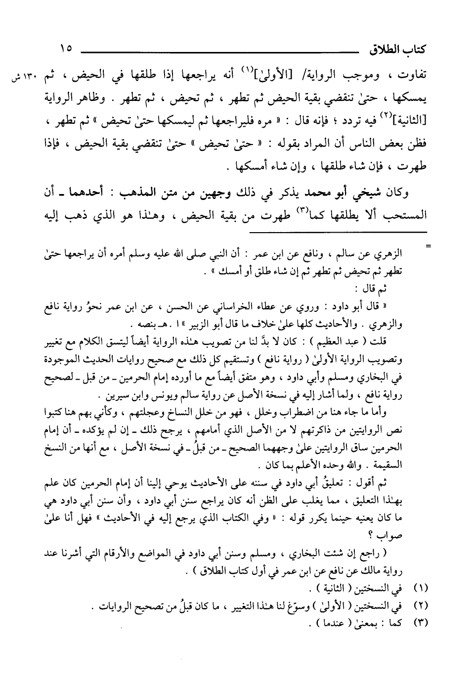 قلت (عبد العظيم): كان لا بدَّ لنا من تصويب هذه الرواية أيضاً ليتسق الكلام مع تغيير وتصويب الرواية الأولى (رواية نافع) وتستقيم كل ذلك مع صحيح روايات الحديث الموجودة في البخاري ومسلم وأبي داود، وهو متفق أيضاً مع ما أورده إمام الحرمين -من قبل- لصحيح رواية نافع، ولما أشار إليه في نسخة الأصل عن رواية سالم ويونس وابن سيرين.