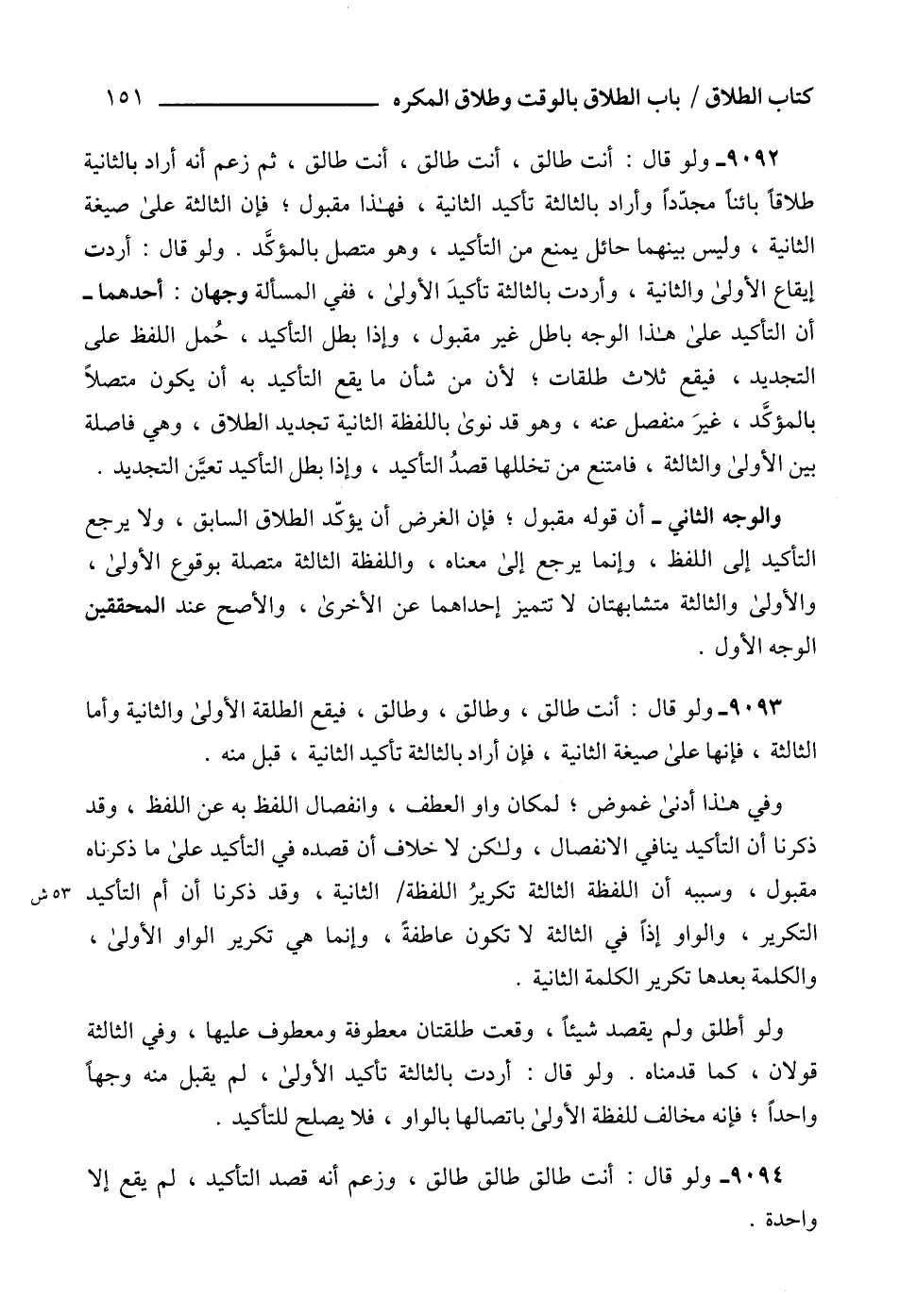 9094 - ولو قال: أنت طالق طالق طالق، وزعم أنه قصد التأكيد، لم يقع إلا واحدة.
