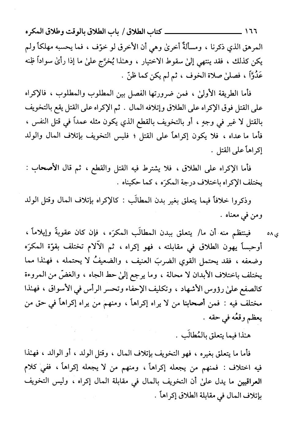 فأما ما يتعلق بغيره، فهو التخويف بإتلاف المال، وقتل الولد، أو الوالد، فهذا فيه اختلاف: فمنهم من يجعله إكراهاً، ومنهم من لا يجعله إكراهاً، ففي كلام العراقيين ما يدل على أن التخويف بالمال في مقابلة المال إكراه، وليس التخويف بإتلاف المال في مقابلة الطلاق إكراهاً.