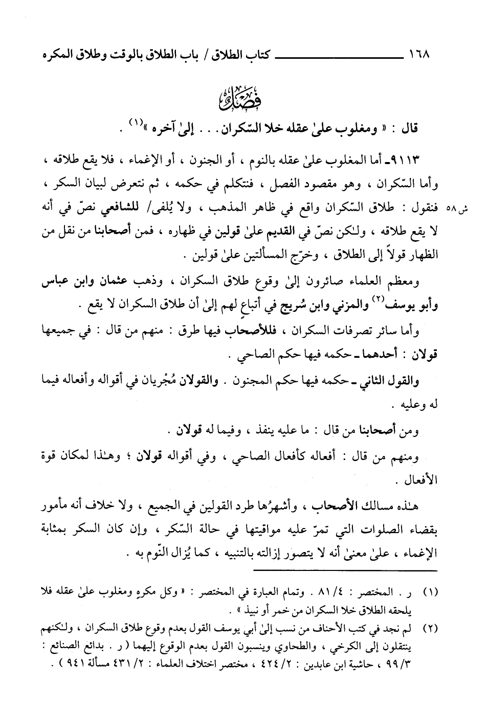 (1) ر. المختصر: 4/ 81. وتمام العبارة في المختصر: "وكل مكرهٍ ومغلوب على عقله فلا يلحقه الطلاق خلا السكران من خمر أو نبيذ".