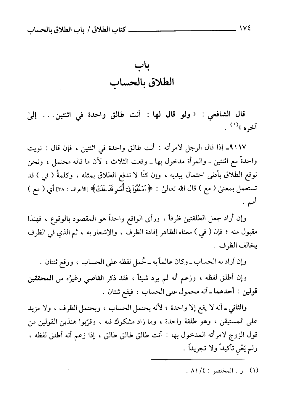 9117 - إذا قال الرجل لامرأته: أنت طالق واحدة في اثنتين، فإن قال: نويت واحدةً مع اثنتين -والمرأة مدخول بها- وقعت الثلاث، لأن ما قاله محتمل، ونحن نوقع الطلاق بأدنى احتمال يبديه، وإن كنّا لا ندفع الطلاق بمثله، وكلمةُ (في) قد تستعمل بمعنى (مع) قال الله تعالى: {ادْخُلُوا فِي أُمَمٍ قَدْ خَلَتْ} [الأعراف: 38] أي (مع) أمم.