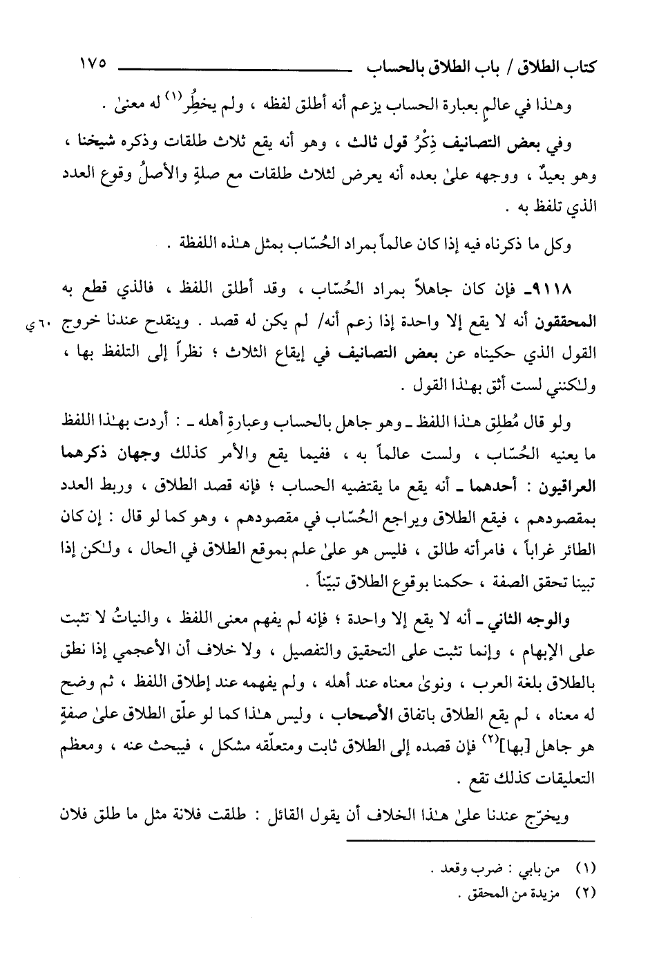 9118 - فإن كان جاهلاً بمراد الحُسّاب، وقد أطلق اللفظ، فالذي قطع به المحققون أنه لا يقع إلا واحدة إذا زعم أنه لم يكن له قصد. وينقدح عندنا خروج القول الذي حكيناه عن بعض التصانيف في إيقاع الثلاث، نظراً إلى التلفظ بها، ولكنني لست أثق بهذا القول.
