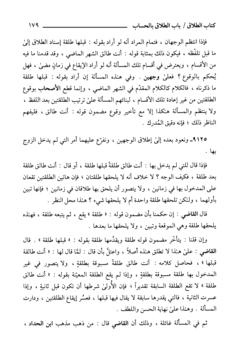 9125 - ونعود بعده إلى إطلاق الوجهين، ونفرّع عليهما أمر التي لم يدخل الزوج بها.