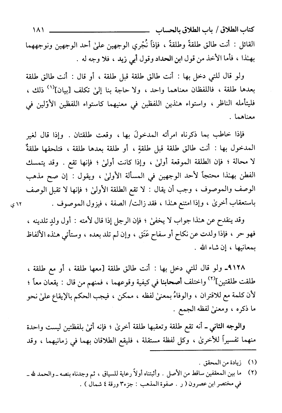 (2) ما بين المعقفين ساقط من الأصل. وأثبتناه أولاً رعاية للسياق، ثم وجدناه بنصه -والحمد لله- في مختصر ابن عصرون (ر. صفوة المذهب: جزء3 ورقة 4 شمال).