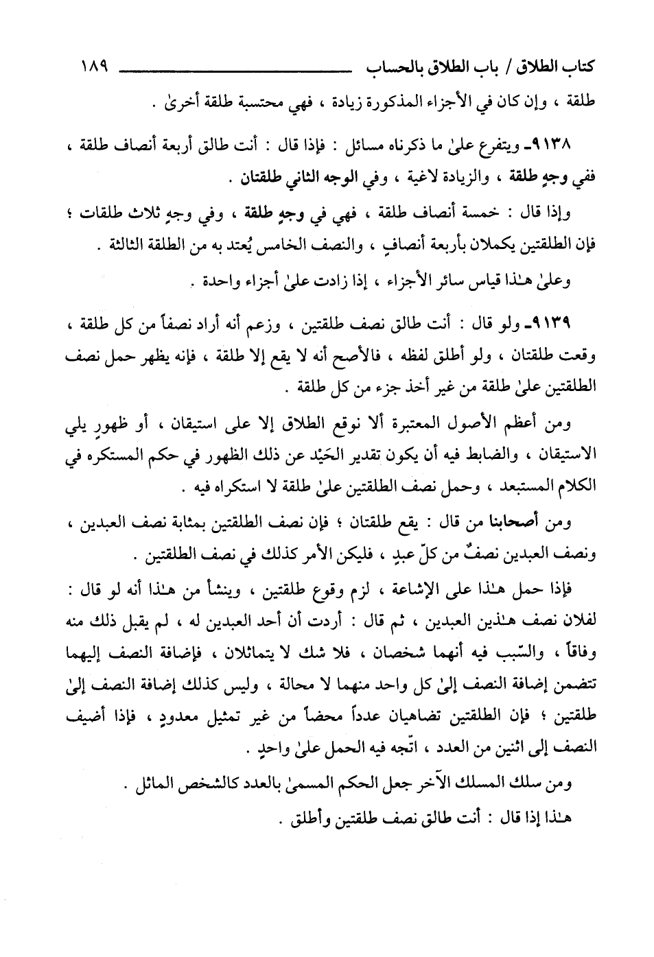 9139 - ولو قال: أنت طالق نصف طلقتين، وزعم أنه أراد نصفاً من كل طلقة، وقعت طلقتان، ولو أطلق لفظه، فالأصح أنه لا يقع إلا طلقة، فإنه يظهر حمل نصف الطلقتين على طلقة من غير أخذ جزء من كل طلقة.