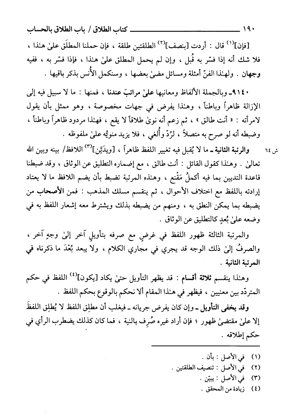9140 - وبالجملة الألفاظ ومعانيها على مراتبَ عندنا، فمنها: ما لا سبيل فيه إلى الإزالة ظاهراً وباطناًً، وهذا يفرض في جهات مخصوصة، وهو ممثل بأن يقول لامرأته: "أنت طالق"، ثم زعم أنه نوى طلاقاً لا يقع، فهذا مردود ظاهراً وباطناً، وضبطه أنه لو صرح به متصلاً، لرُدّ وأُلغي، فلا يزيد منويُّه على ملفوظه.