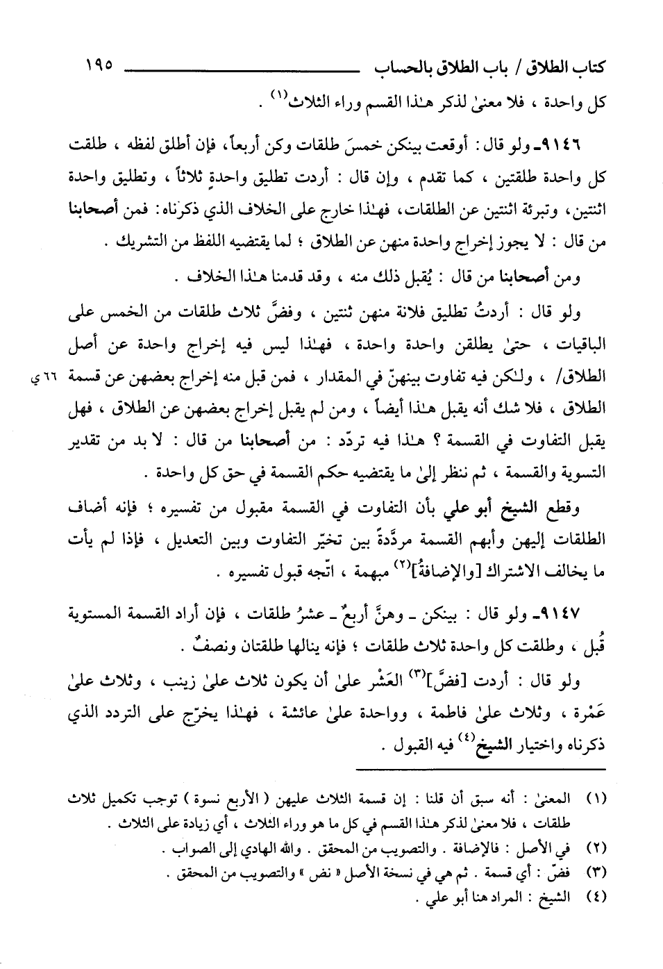 (1) المعنى: أنه سبق أن قلنا: إن قسمة الثلاث عليهن (الأربع نسوة) توجب تكميل ثلاث طلقات، فلا معنى لذكر هذا القسم في كل ما هو وراء الثلاث، أي زيادة على الثلاث.
