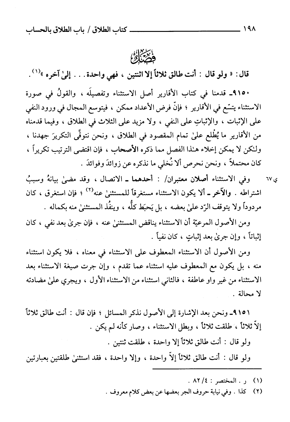 9151 - ونحن بعد الإشارة إلى الأصول نذكر المسائل؛ فإن قال: أنت طالق ثلاثاًً إلاّ ثلاثاً، طلقت ثلاثاً، وبطل الاستثناء، وصار كأنه لم يكن.