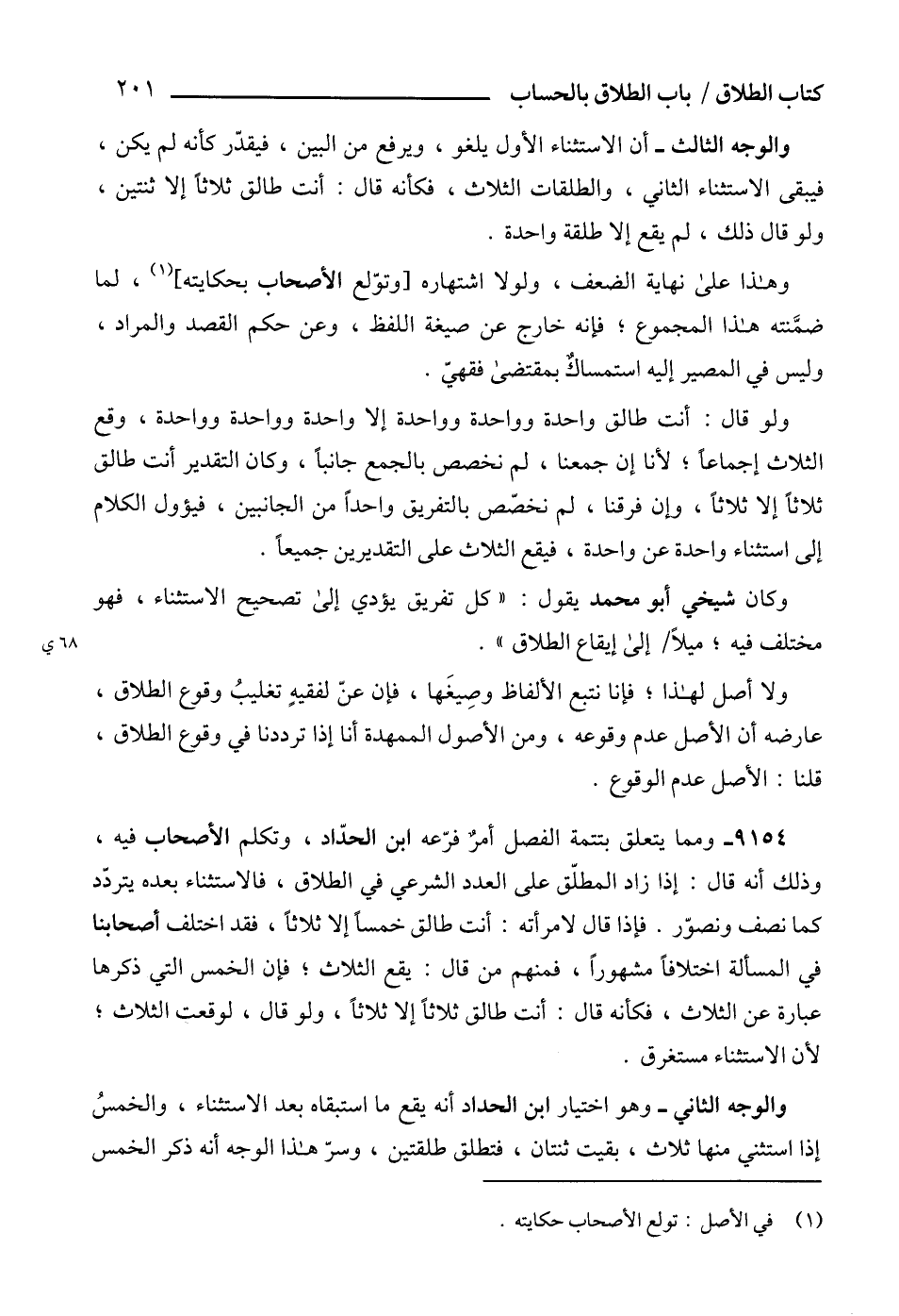 9154 - ومما يتعلق بتتمة الفصل أمرٌ فرّعه ابن الحدّاد، وتكلم الأصحاب فيه، وذلك أنه قال: إذا زاد المطلّق على العدد الشرعي في الطلاق، فالاستثناء بعده يتردّد كما نصف ونصوّر. فإذا قال لامرأته: أنت طالق خمساً إلا ثلاثاًً، فقد اختلف أصحابنا في المسألة اختلافاً مشهوراً، فمنهم من قال: يقع الثلاث؛ فإن الخمس التي ذكرها عبارة عن الثلاث، فكأنه قال: أنت طالق ثلاثاًً إلا ثلاثاًً، ولو قال، لوقعت الثلاث؛ لأن الاستثناء مستغرق.