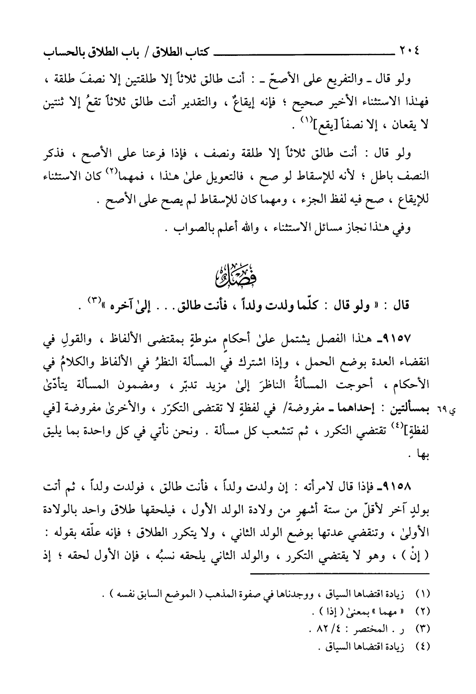 9157 - هذا الفصل يشتمل على أحكامٍ منوطةٍ بمقتضى الألفاظ، والقولِ في انقضاء العدة بوضع الحمل، وإذا اشترك في المسألة النظرُ في الألفاظ والكلامُ في الأحكام، أحوجت المسألةُ الناظرَ إلى مزيد تدبّر، ومضمون المسألة يتأدّى بمسألتين: إحداهما - مفروضة في لفظةٍ لا تقتضى التكرّر، والأخرى مفروضة [في لفظةٍ] (4) تقتضي التكرر، ثم تتشعب كل مسألة. ونحن نأتي في كل واحدة بما يليق بها.