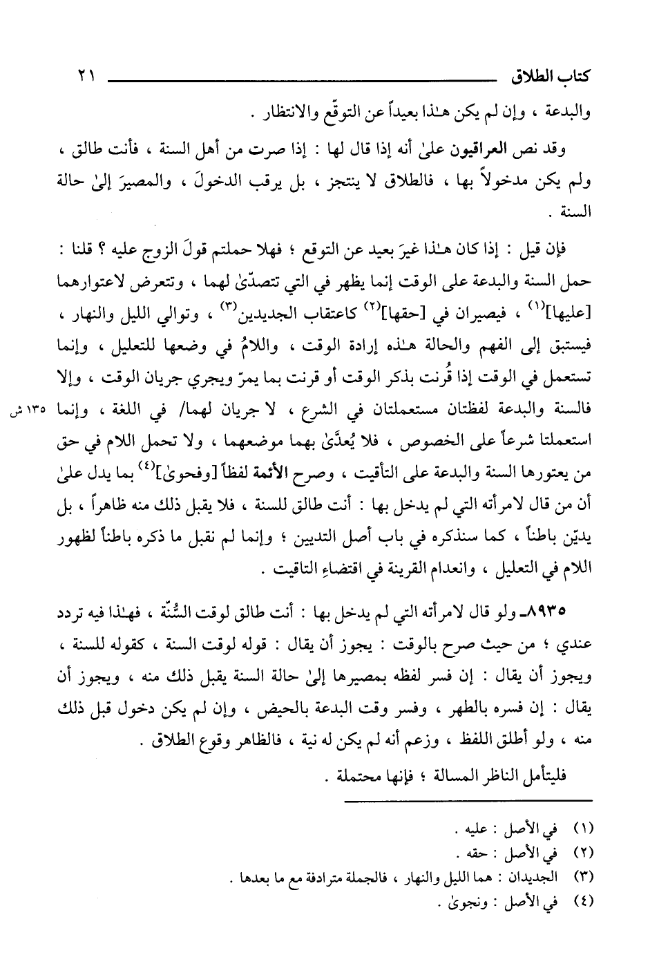 فإن قيل: إذا كان هذا غيرَ بعيد عن التوقع، فهلا حملتم قولَ الزوج عليه؟ قلنا: حمل السنة والبدعة على الوقت إنما يظهر في التي تتصدّى لهما، وتتعرض لاعتوارهما [عليها] (1)، فيصيران في [حقها] (2) كاعتقاب الجديدين (3)، وتوالي الليل والنهار، فيستبق إلى الفهم والحالة هذه إرادة الوقت، واللامُ في وضعها للتعليل، وإنما تستعمل في الوقت إذا قُرنت بذكر الوقت أو قرنت بما يمرّ ويجري جريان الوقت، وإلا فالسنة والبدعة لفظتان مستعملتان في الشرع، لا جريان لهما في اللغة، وإنما استعملتا شرعاً على الخصوص، فلا يُعدَّى بهما موضعهما، ولا تحمل اللام في حق من يعتورها السنة والبدعة على التأقيت، وصرح الأئمة لفظاً [وفحوى] (4) بما يدل على أن من قال لامرأته التي لم يدخل بها: أنت طالق للسنة، فلا يقبل ذلك منه ظاهراً، بل يديّن باطناً، كما سنذكره في باب أصل التديين؛ وإنما لم نقبل ما ذكره باطناً لظهور اللام في التعليل، وانعدام القرينة في اقتضاءِ التأقيت.