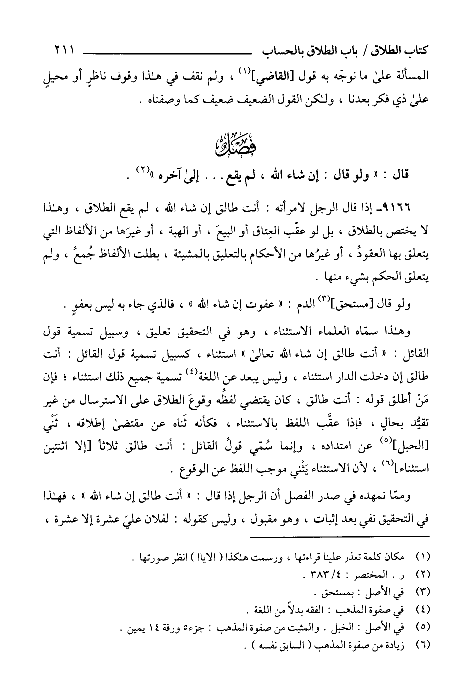 وهذا سمّاه العلماء الاستثناء، وهو في التحقيق تعليق، وسبيل تسمية قول القائل: "أنت طالق إن شاء الله تعالى" استثناء، كسبيل تسمية قول القائل: أنت طالق إن دخلت الدار استثناء، وليس يبعد عن اللغة (4) تسمية جميع ذلك استثناء؛ فإن مَنْ أطلق قوله: أنت طالق، كان يقتضي لفظُه وقوعَ الطلاق على الاسترسال من غير تقيُّد بحالٍ، فإذا عقَّب اللفظ بالاستثناء، فكأنه ثَناه عن مقتضى إطلاقه، ثَنْي [الحبل] (5) عن امتداده، وإنما سُمّي قولُ القائل: أنت طالق ثلاثاً [إلا اثنتين استثناء] (6)، لأن الاستثناء يَثْني موجب اللفظ عن الوقوع.