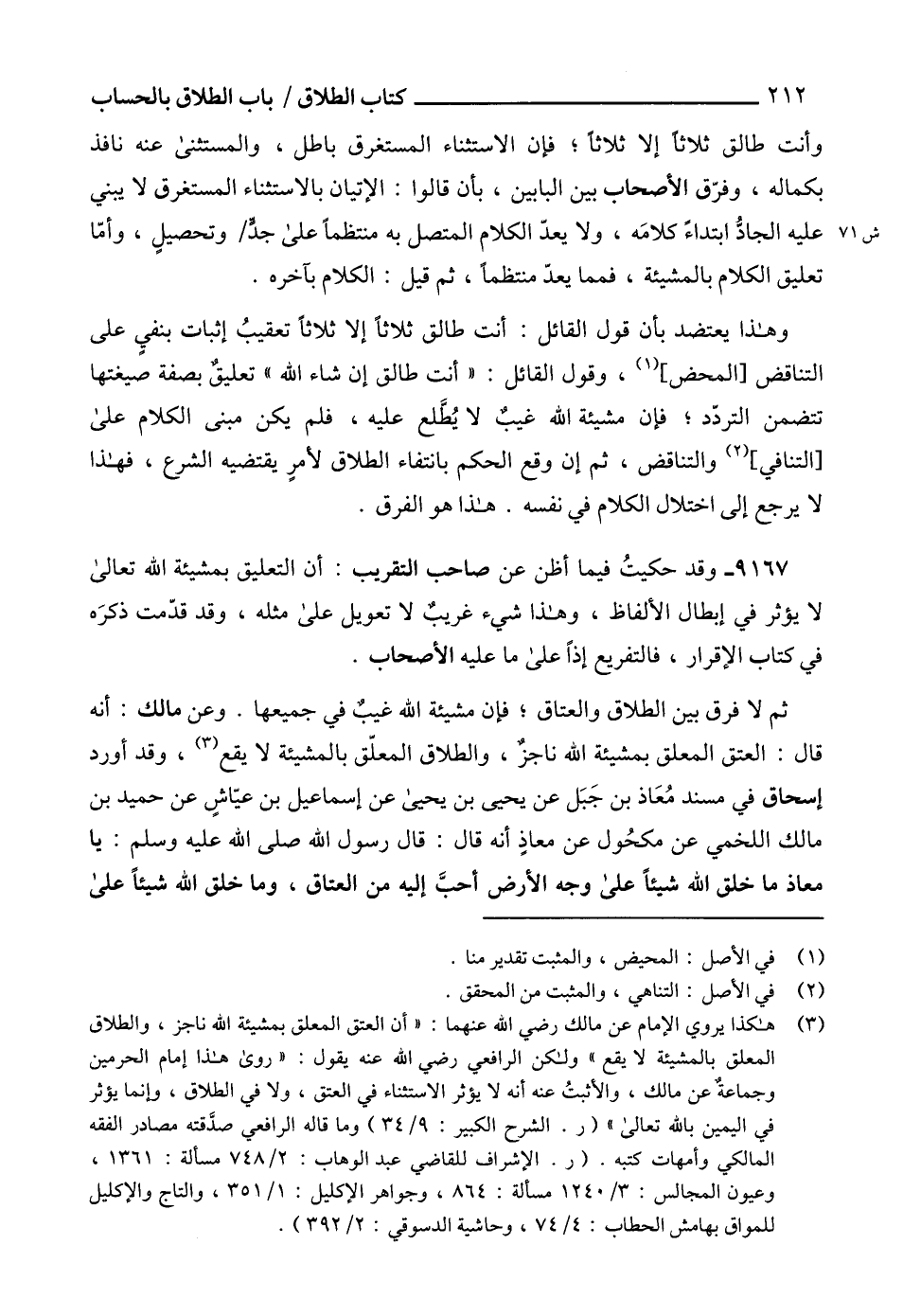 (3) هكذا يروي الإمام عن مالك رضي الله عنهما: "أن العتق المعلق بمشيئة الله ناجز، والطلاق المعلق بالمشيئة لا يقع" ولكن الرافعي رضي الله عنه يقول: "روى هذا إمام الحرمين وجماعةٌ عن مالك، والأثبتُ عنه أنه لا يؤثر الاستثناء في العتق، ولا في الطلاق، وإنما يؤثر في اليمين بالله تعالى" (ر. الشرح الكبير: 9/ 34) وما قاله الرافعي صدَّقته مصادر الفقه المالكي وأمهات كتبه. (ر. الإشراف للقاضي عبد الوهاب: 2/ 748 مسألة: 1361، وعيون المجالس: 3/ 1240 مسألة: 864، وجواهر الإكليل: 1/ 351، والتاج والإكليل للمواق بهامش الحطاب: 4/ 74، وحاشية الدسوقي: 2/ 392).
