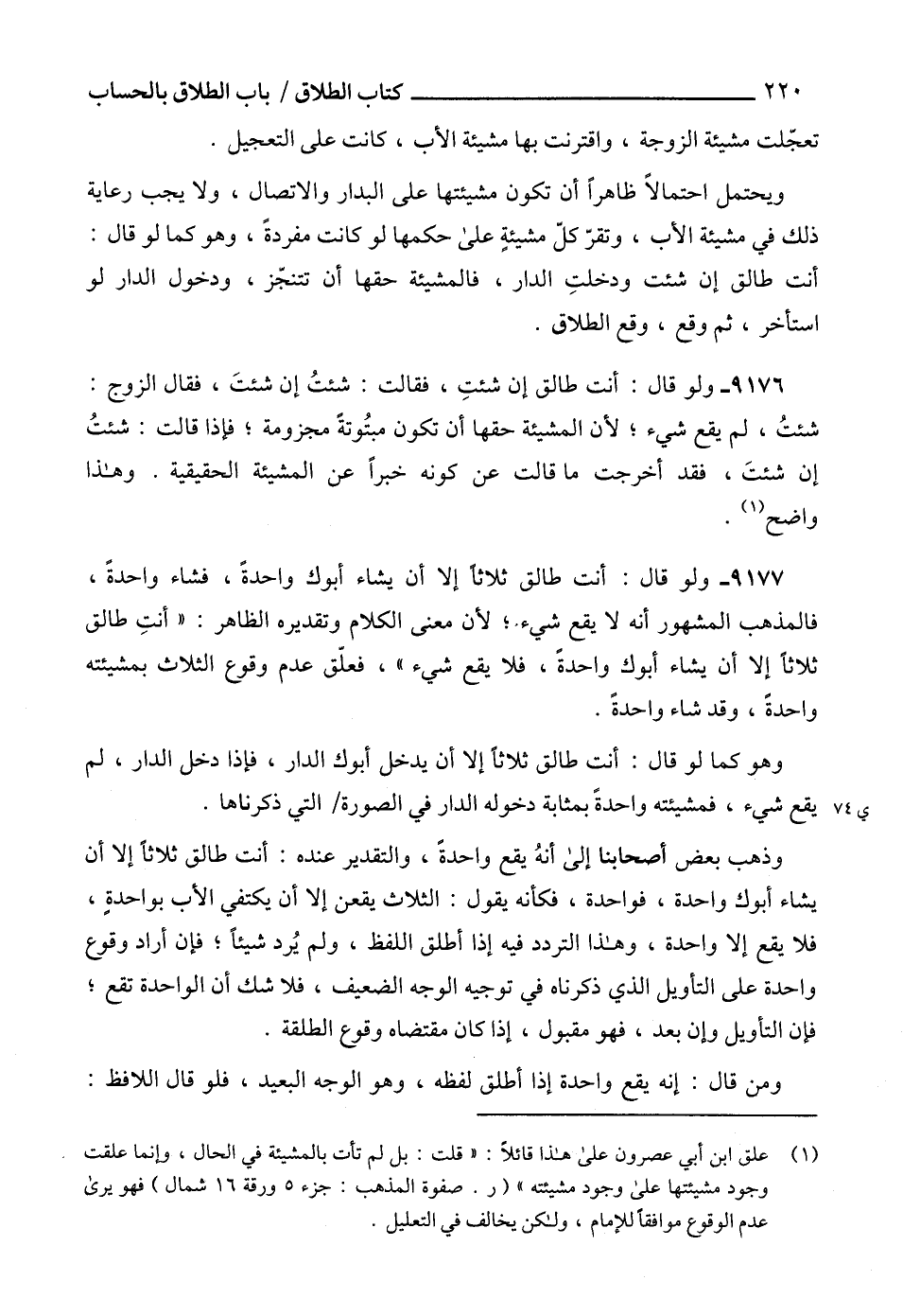 (1) علق ابن أبي عصرون على هذا قائلاً: "قلت: بل لم تأت بالمشيئة في الحال، وإنما علقت وجود مشيئتها على وجود مشيئته" (ر. صفوة المذهب: جزء5 ورقة 16 شمال) فهو يرى عدم الوقوع موافقاً للإمام، ولكن يخالف في التعليل.