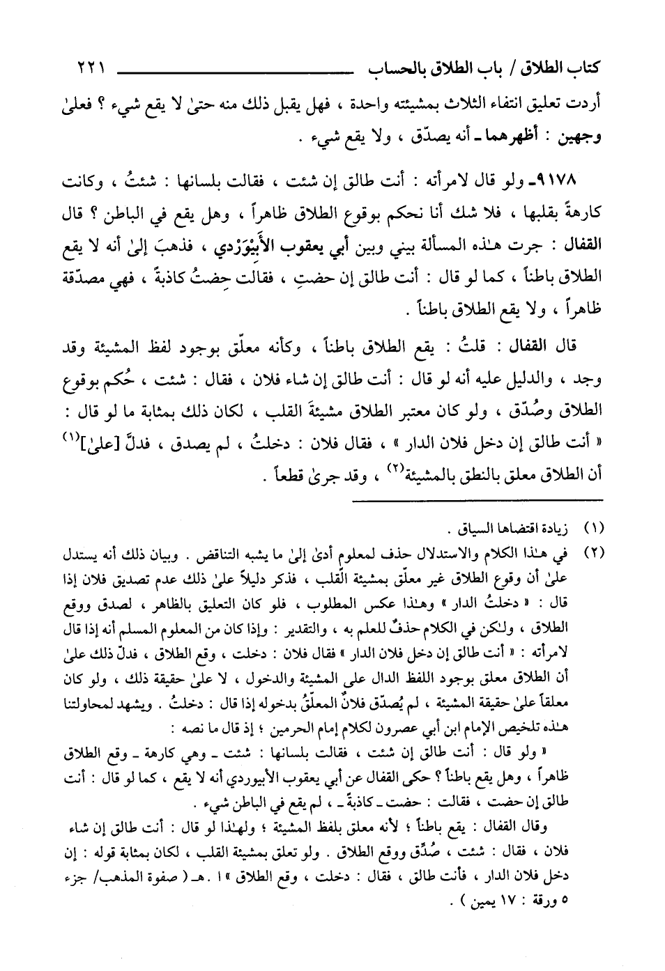 (2) في هذا الكلام والاستدلال حذف لمعلومٍ أدى إلى ما يشبه التناقض. وبيان ذلك أنه يستدل على أن وقوع الطلاق غير معلّق بمشيئة القلب، فذكر دليلاً على ذلك عدم تصديق فلان إذا قال: "دخلتُ الدار" وهذا عكس المطلوب، فلو كان التعليق بالظاهر، لصدق ووقع الطلاق، ولكن في الكلام حذفٌ للعلم به، والتقدير: وإذا كان من المعلوم المسلم أنه إذا قال لامرأته: "أنت طالق إن دخل فلان الدار" فقال فلان: دخلت، وقع الطلاق، فدلّ ذلك على أن الطلاق معلق بوجود اللفظ الدال على المشيئة والدخول، لا على حقيقة ذلك، ولو كان معلقاً على حقيقة المشيئة، لم يُصدّق فلانٌ المعلّقُ بدخوله إذا قال: دخلتُ. ويشهد لمحاولتنا هذه تلخيص الإمام ابن أبي عصرون لكلام إمام الحرمين؛ إذ قال ما نصه: