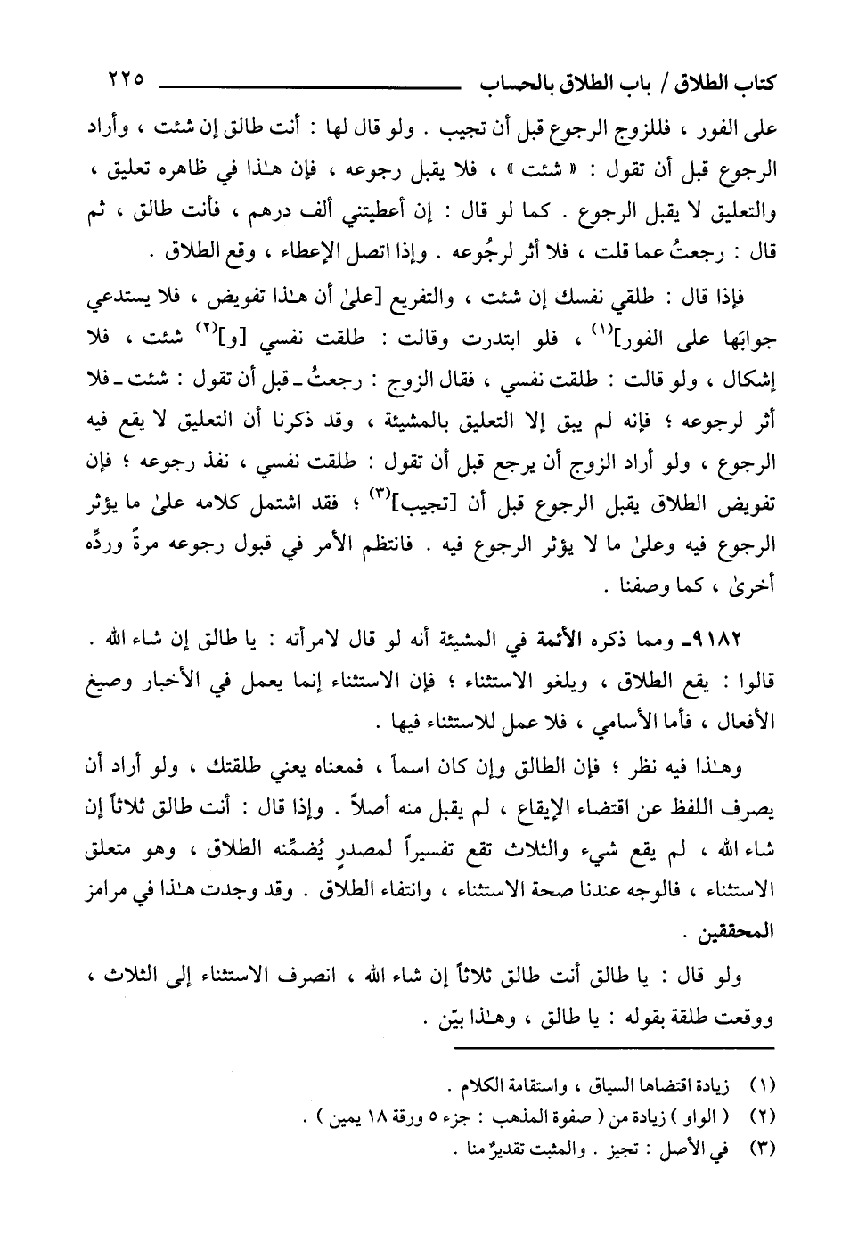 9182 - ومما ذكره الأئمة في المشيئة أنه لو قال لامرأته: يا طالق إن شاء الله.