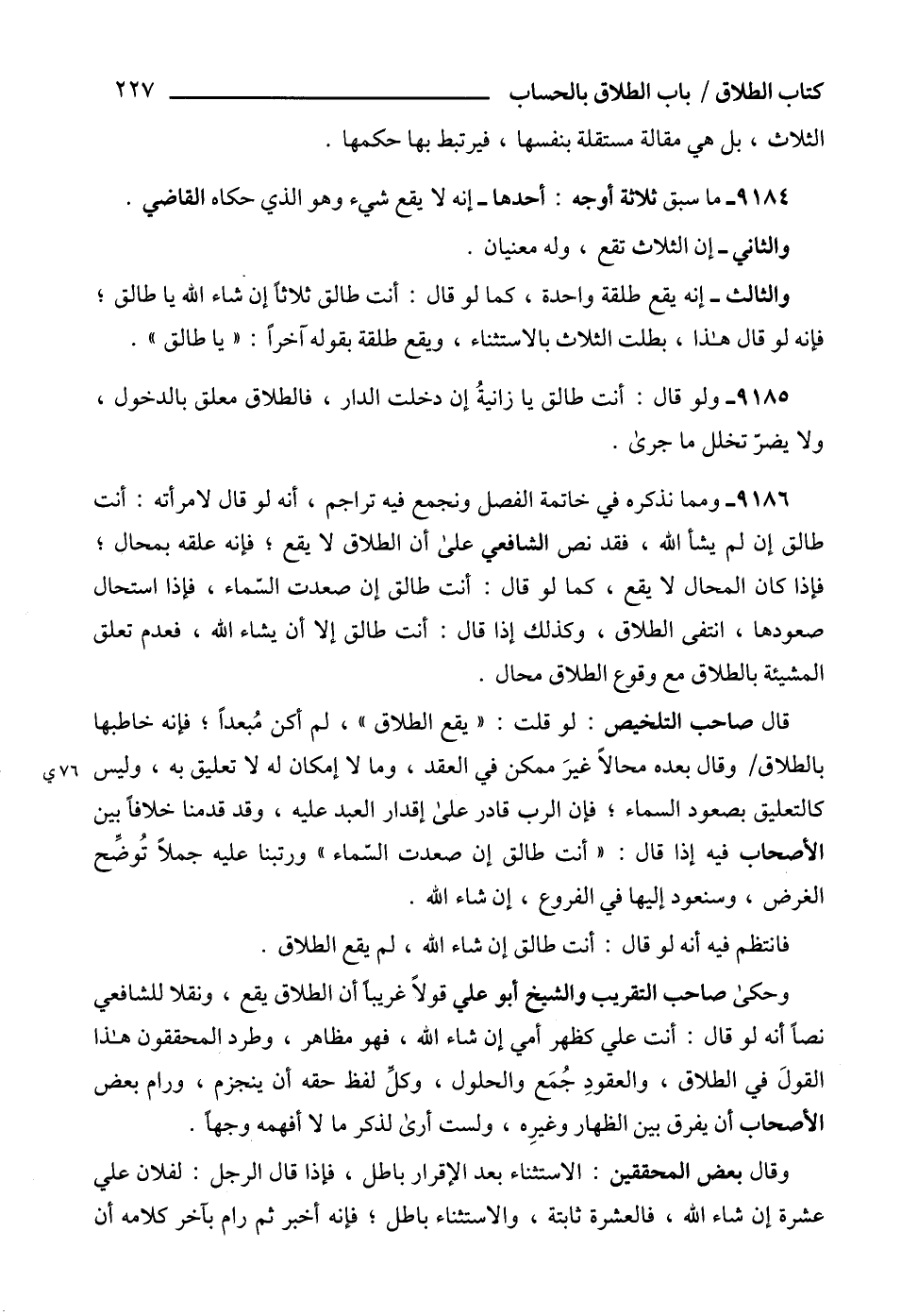 9185 - ولو قال: أنت طالق يا زانيةُ إن دخلت الدار، فالطلاق معلق بالدخول، ولا يضرّ تخلل ما جرى.