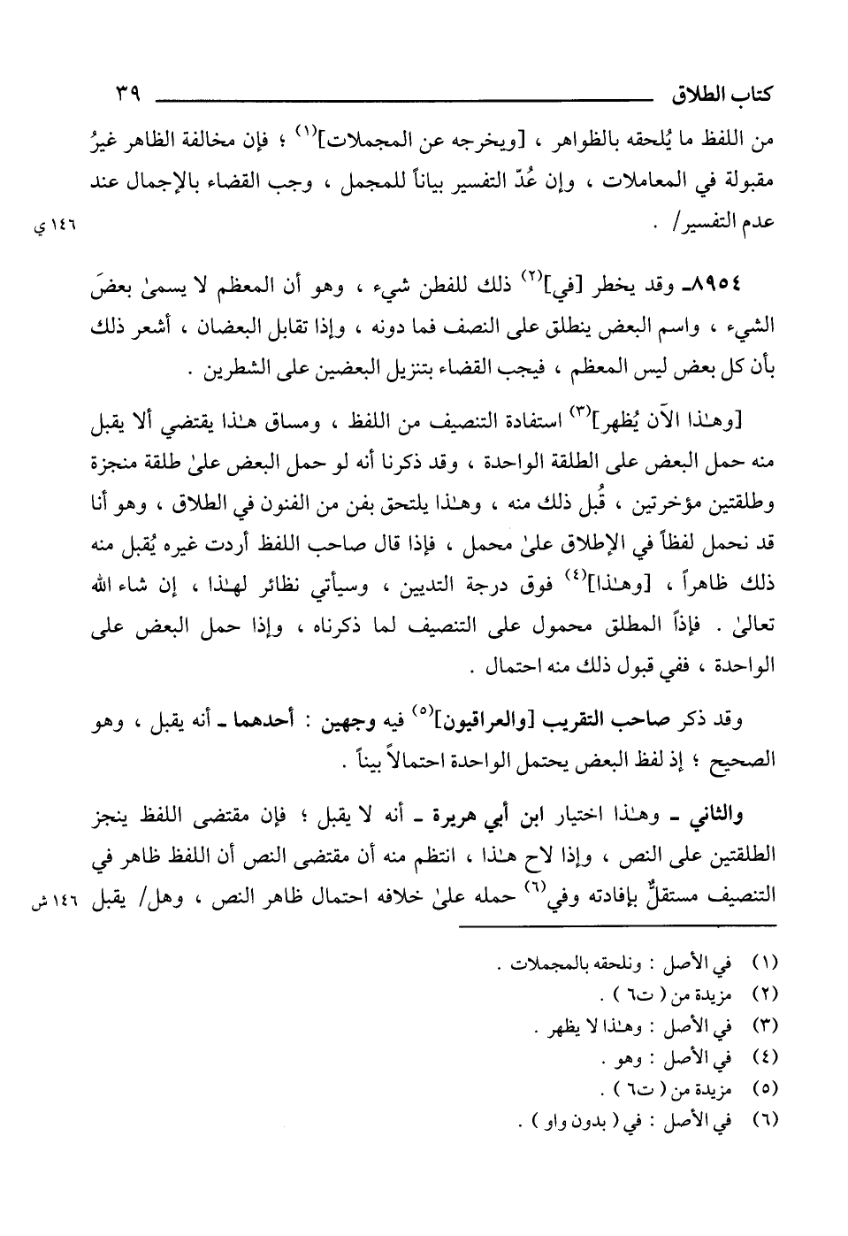 [وهذا الآن يُظهر] (3) استفادة التنصيف من اللفظ، ومساق هذا يقتضي ألا يقبل منه حمل البعض على الطلقة الواحدة، وقد ذكرنا أنه لو حمل البعض على طلقة منجزة وطلقتين مؤخرتين، قُبل ذلك منه، وهذا يلتحق بفن من الفنون في الطلاق، وهو أنا قد نحمل لفظاً في الإطلاق على محمل، فإذا قال صاحب اللفظ أردت غيره يُقبل منه ذلك ظاهراً، [وهذا] (4) فوق درجة التديين، وسيأتي نظائر لهذا، إن شاء الله تعالى. فإذاً المطلق محمول على التنصيف لما ذكرناه، وإذا حمل البعض على الواحدة، ففي قبول ذلك منه احتمال.