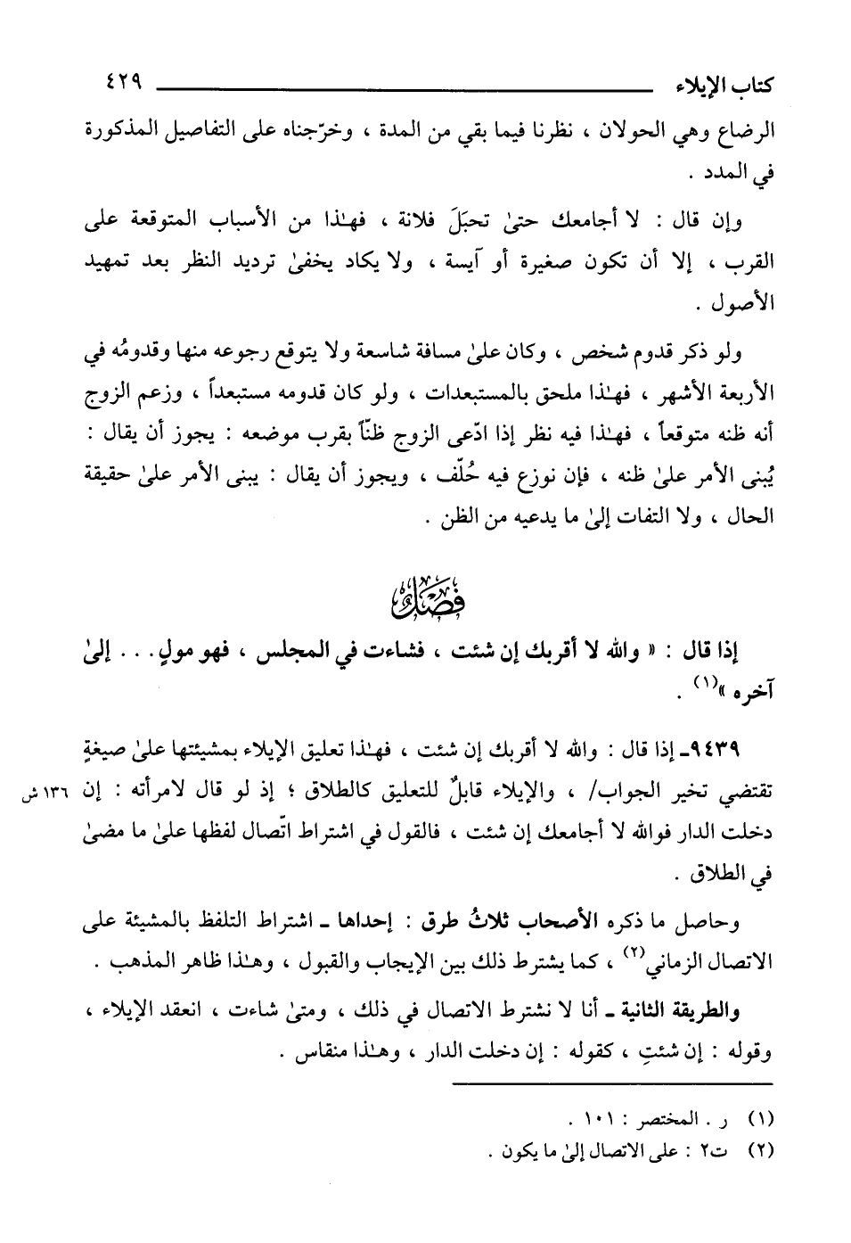 9439 - إذا قال: والله لا أقربك إن شئت، فهذا تعليق الإيلاء بمشيئتها على صيغةٍ تقتضي تخير الجواب، والإيلاء قابلٌ للتعليق كالطلاق؛ إذ لو قال لامرأته: إن دخلت الدار فوالله لا أجامعك إن شئت، فالقول في اشتراط اتّصال لفظها على ما مضى في الطلاق.