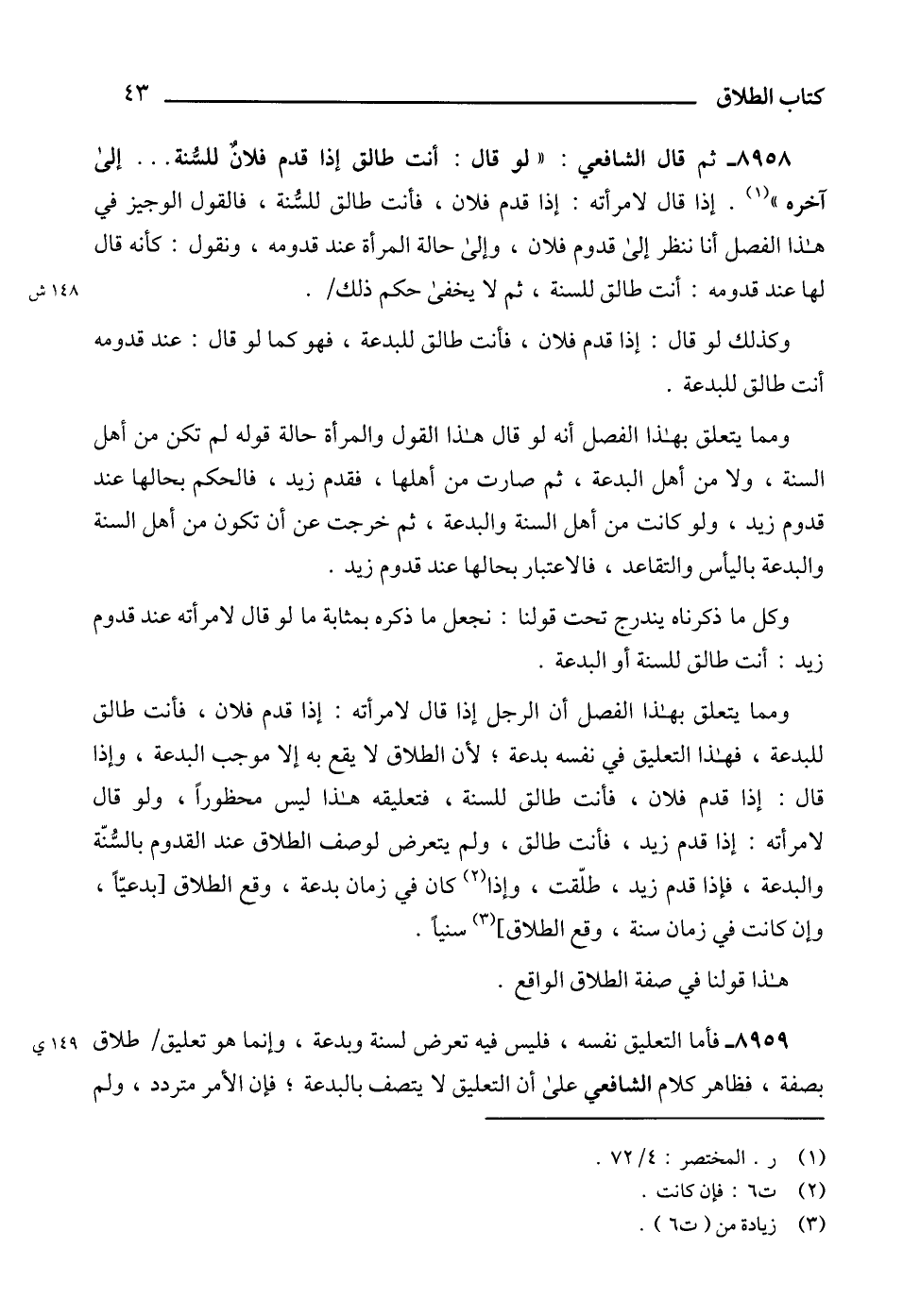 8959 - فأما التعليق نفسه، فليس فيه تعرض لسنة وبدعة، وإنما هو تعليق طلاق بصفة، فظاهر كلام الشافعي على أن التعليق لا يتصف بالبدعة؛ فإن الأمر متردد، ولم