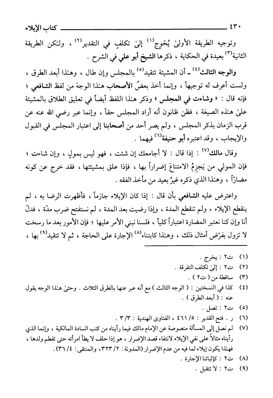 (7) لم نصل إلى المسألة منصوصة عن الإمام مالك فيما رأيناه من كتب السادة المالكية، وإنما الذي رأيناه مثالاً على نفي الإيلاء لانتفاء قصد الإضرار، هو إذا حلف لا يطأ امرأته حتى تفطم ولدها، فهذا يكون إيلاء لما فيه من عدم الإضرار (المدونة: 2/ 323، والمنتقى: 4/ 36).