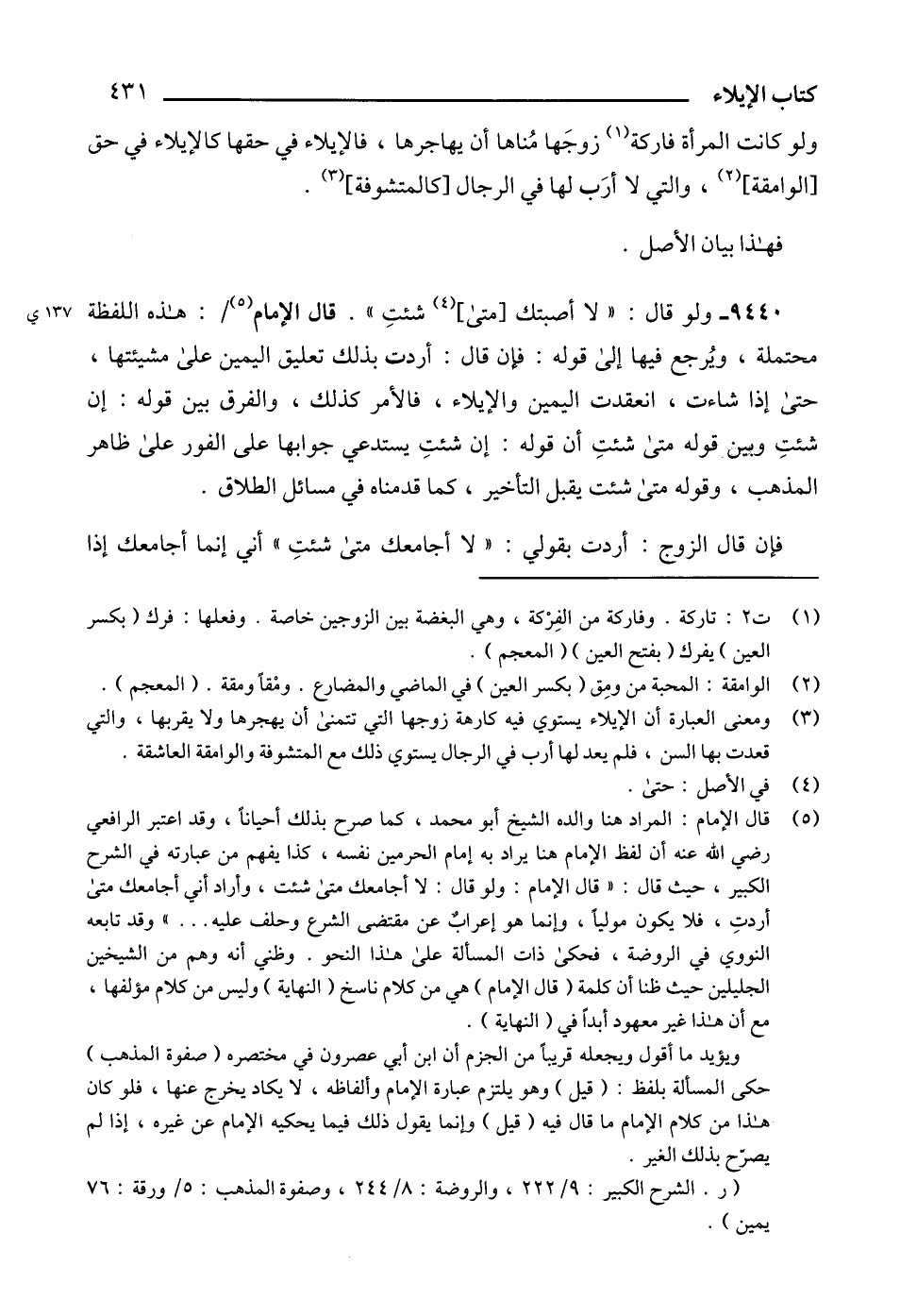 (5) قال الإمام: المراد هنا والده الشيخ أبو محمد، كما صرح بذلك أحياناً، وقد اعتبر الرافعي رضي الله عنه أن لفظ الإمام هنا يراد به إمام الحرمين نفسه، كذا يفهم من عبارته في الشرح الكبير، حيث قال: "قال الإمام: ولو قال: لا أجامعك متى شئت، وأراد أني أجامعك متى أردتِ، فلا يكون مولياً، وإنما هو إعرابٌ عن مقتضى الشرع وحلف عليه ... " وقد تابعه النووي في الروضة، فحكى ذات المسألة على هذا النحو. وظني أنه وهم من الشيخين الجليلين حيث ظنا أن كلمة (قال الإمام) هي من كلام ناسخ (النهاية) وليس من كلام مؤلفها، مع أن هذا غير معهود أبداً في (النهاية).