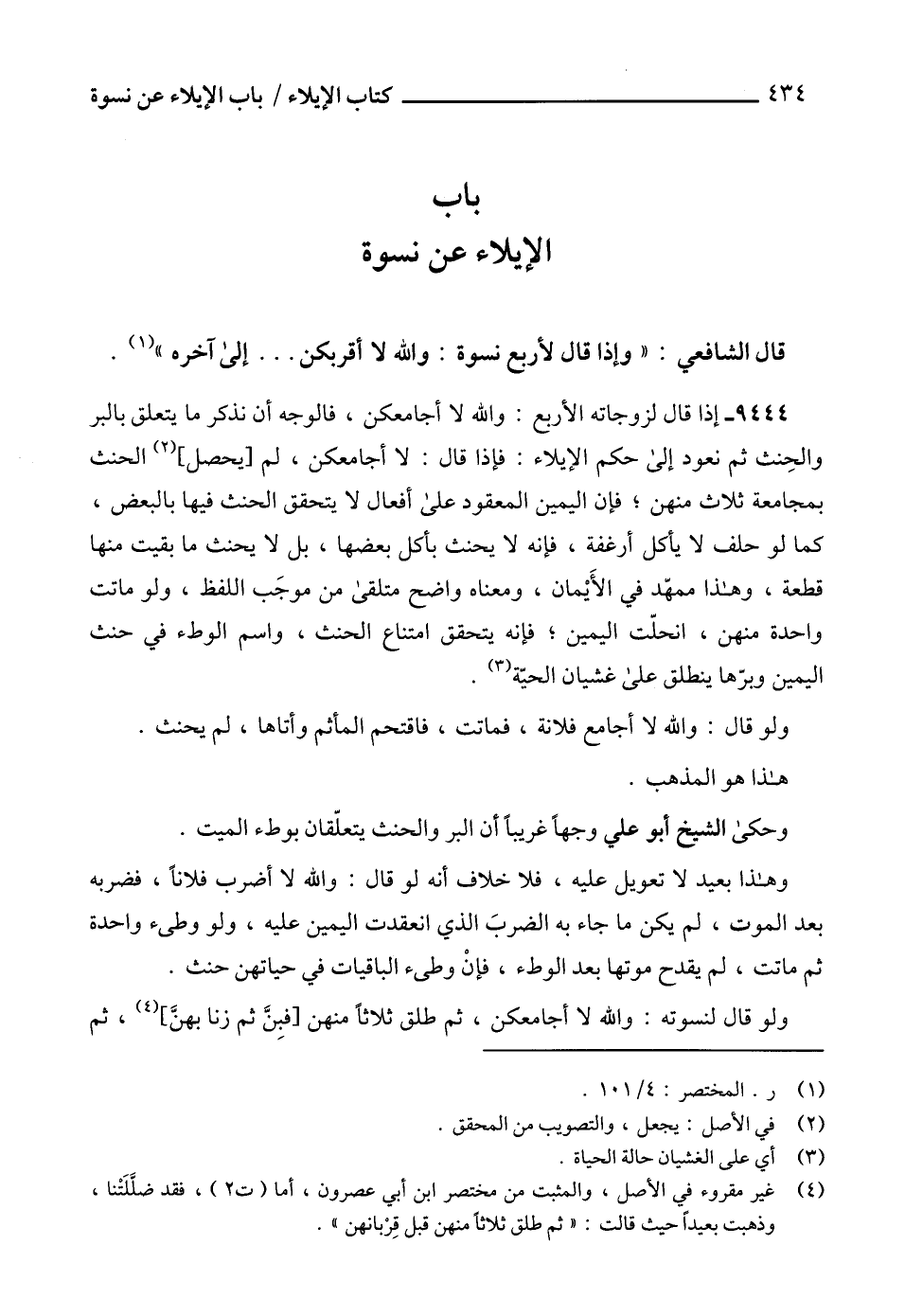 9444 - إذا قال لزوجاته الأربع: والله لا أجامعكن، فالوجه أن نذكر ما يتعلق بالبر والحِنث ثم نعود إلى حكم الإيلاء: فإذا قال: لا أجامعكن، لم [يحصل] (2) الحنث بمجامعة ثلاث منهن؛ فإن اليمين المعقود على أفعال لا يتحقق الحنث فيها بالبعض، كما لو حلف لا يأكل أرغفة، فإنه لا يحنث بأكل بعضها، بل لا يحنث ما بقيت منها قطعة، وهذا ممهّد في الأَيْمان، ومعناه واضح متلقى من موجَب اللفظ، ولو ماتت واحدة منهن، انحلّت اليمين؛ فإنه يتحقق امتناع الحنث، واسم الوطء في حنث اليمين وبرّها ينطلق على غشيان الحيّة (3).
