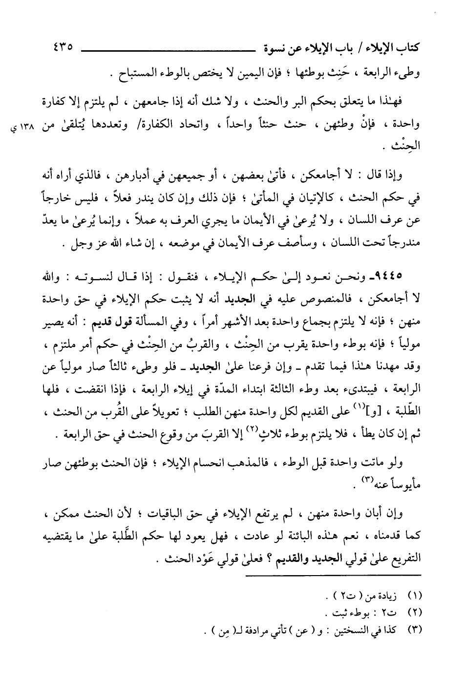 9445 - ونحن نعود إلى حكم الإيلاء، فنقول: إذا قال لنسوته: والله لا أجامعكن، فالمنصوص عليه في الجديد أنه لا يثبت حكم الإيلاء في حق واحدة منهن؛ فإنه لا يلتزم بجماع واحدة بعد الأشهر أمراً، وفي المسألة قول قديم: أنه يصير مولياً؛ فإنه بوطء واحدة يقرب من الحِنْث، والقربُ من الحِنْث في حكم أمر ملتزم، وقد مهدنا هذا فيما تقدم -وإن فرعنا على الجديد- فلو وطىء ثالثاً صار مولياً عن الرابعة، فيبتدىء بعد وطء الثالثة ابتداء المدّة في إيلاء الرابعة، فإذا انقضت، فلها الطّلبة، [و] (1) على القديم لكل واحدة منهن الطلب؛ تعويلاً على القُرب من الحنث، ثم إن كان يطأ، فلا يلتزم بوطء ثلاثٍ (2) إلا القربَ من وقوع الحنث في حق الرابعة.
