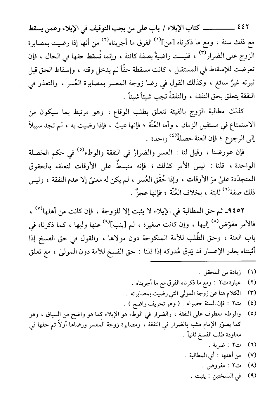 (5) والوطء معطوف على النفقة، والضرار في الوطء هو الإيلاء كما هو واضح من السياق، وهو كما يصوّر الإمام مشبه بالضرار في النفقة، ومصابرة زوجة المعسر ورضاها أولاً ثم حقها في معاودة طلب الفسخ ثانياً.