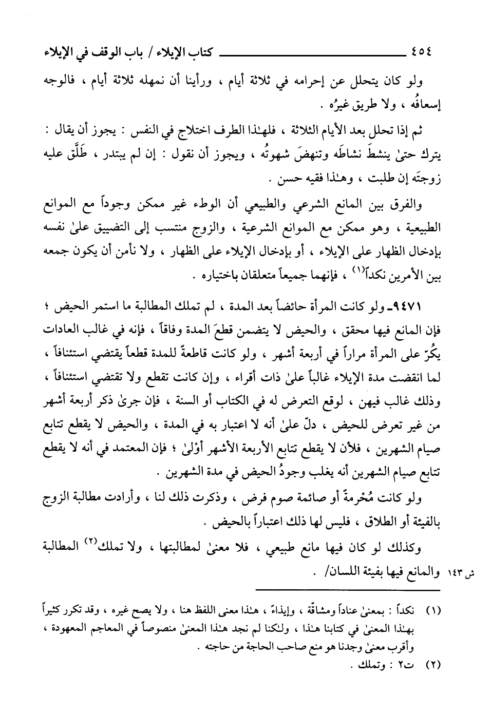 9471 - ولو كانت المرأة حائضاً بعد المدة، لم تملك المطالبة ما استمر الحيض؛ فإن المانع فيها محقق، والحيض لا يتضمن قطعَ المدة وفاقاً، فإنه في غالب العادات يكُرّ على المرأة مراراً في أربعة أشهر، ولو كانت قاطعةً للمدة قطعاً يقتضي استئنافاً، لما انقضت مدة الإيلاء غالباً على ذات أقراء، وإن كانت تقطع ولا تقتضي استئنافاً، وذلك غالب فيهن، لوقع التعرض له في الكتاب أو السنة، فإن جرى ذكر أربعة أشهر من غير تعرض للحيض، دلّ على أنه لا اعتبار به في المدة، والحيض لا يقطع تتابع صيام الشهرين، فلأن لا يقطع تتابع الأربعة الأشهر أوْلى؛ فإن المعتمد في أنه لا يقطع تتابع صيام الشهرين أنه يغلب وجودُ الحيض في مدة الشهرين.