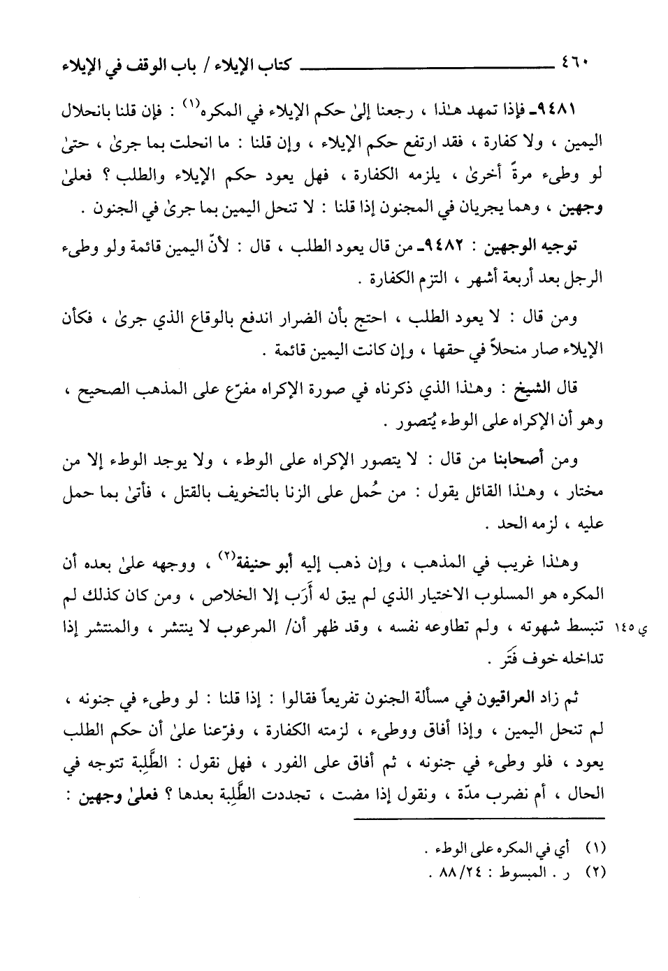 9481 - فإذا تمهد هذا، رجعنا إلى حكم الإيلاء في المكره (1): فإن قلنا بانحلال اليمين، ولا كفارة، فقد ارتفع حكم الإيلاء، وإن قلنا: ما انحلت بما جرى، حتى لو وطىء مرة أخرى، يلزمه الكفارة، فهل يعود حكم الإيلاء والطلب؟ فعلى وجهين، وهما يجريان في المجنون إذا قلنا: لا تنحل اليمين بما جرى في الجنون.
