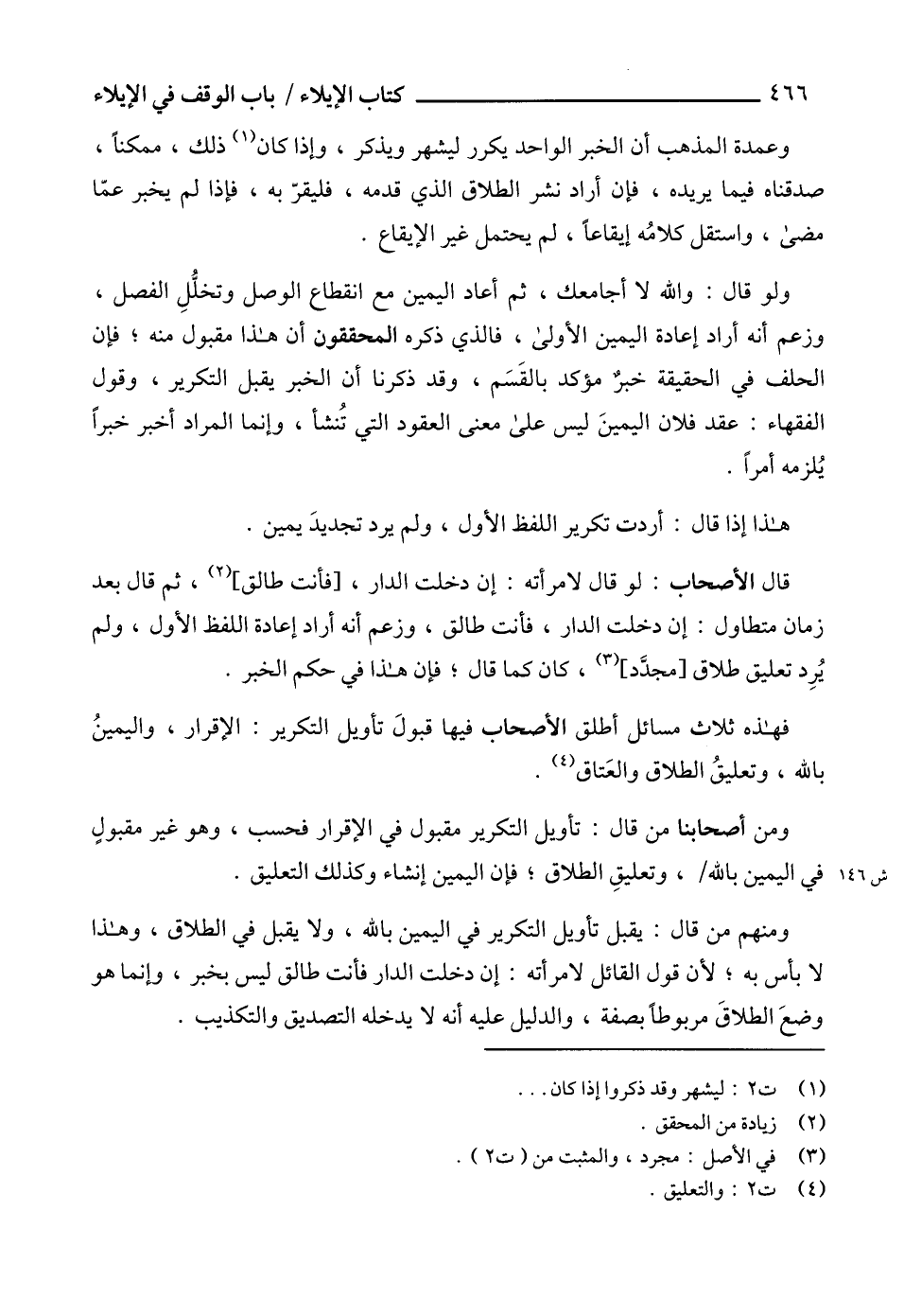 فهذه ثلاث مسائل أطلق الأصحاب فيها قبولَ تأويل التكرير: الإقرار، واليمينُ بالله، وتعليقُ الطلاق والعَتاق (4).