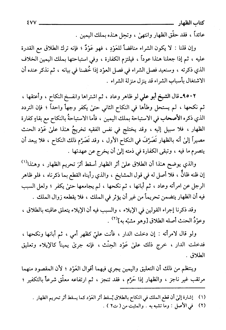 9502 - قال الشيخ أبو علي لو ظاهر وعاد، ثم اشتراها وانفسخ النكاح، وأعتقها، ثم نكحها، لم يستحل وطأها في النكاح الثاني حتى يكفر وجهاً واحداً؟ فإن التردد الذي ذكره الأصحاب في الاستباحة بملك اليمين، فأما الاستباحةُ بالنكاح مع بقاءٍ كفارة الظهار، فلا سبيل إليه، وقد يختلج في نفس الفقيه تخريجُ هذا على عَوْد الحنث مصيراً إلى أنه بالظهار تَصَرَّفَ في النكاح الأول، وقد تَصَرَّم ذلك النكاح، فلا يبعد أن يتصرم ما فيه، وتبقى الكفارة في ذمته إلى أن يخرج عن عهدتها.