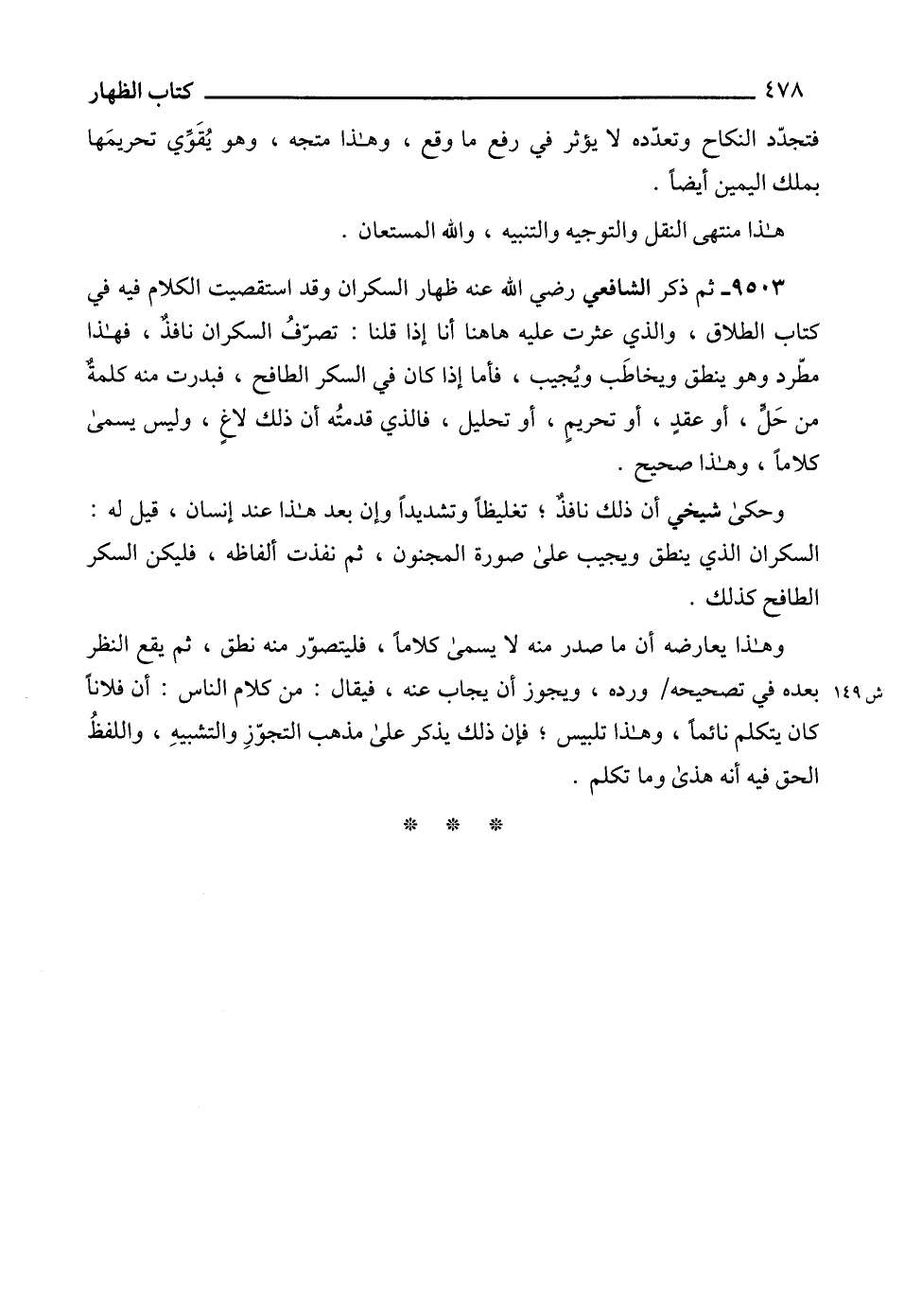 9503 - ثم ذكر الشافعي رضي الله عنه ظهار السكران وقد استقصيت الكلام فيه في كتاب الطلاق، والذي عثرت عليه هاهنا أنا إذا قلنا: تصرّفُ السكران نافذٌ، فهذا مطّرد وهو ينطق ويخاطَب ويُجيب، فأما إذا كان في السكر الطافح، فبدرت منه كلمةٌ من حَلٍّ، أو عقدٍ، أو تحريمٍ، أو تحليل، فالذي قدمتُه أن ذلك لاغٍ، وليس يسمى كلاماً، وهذا صحيح.