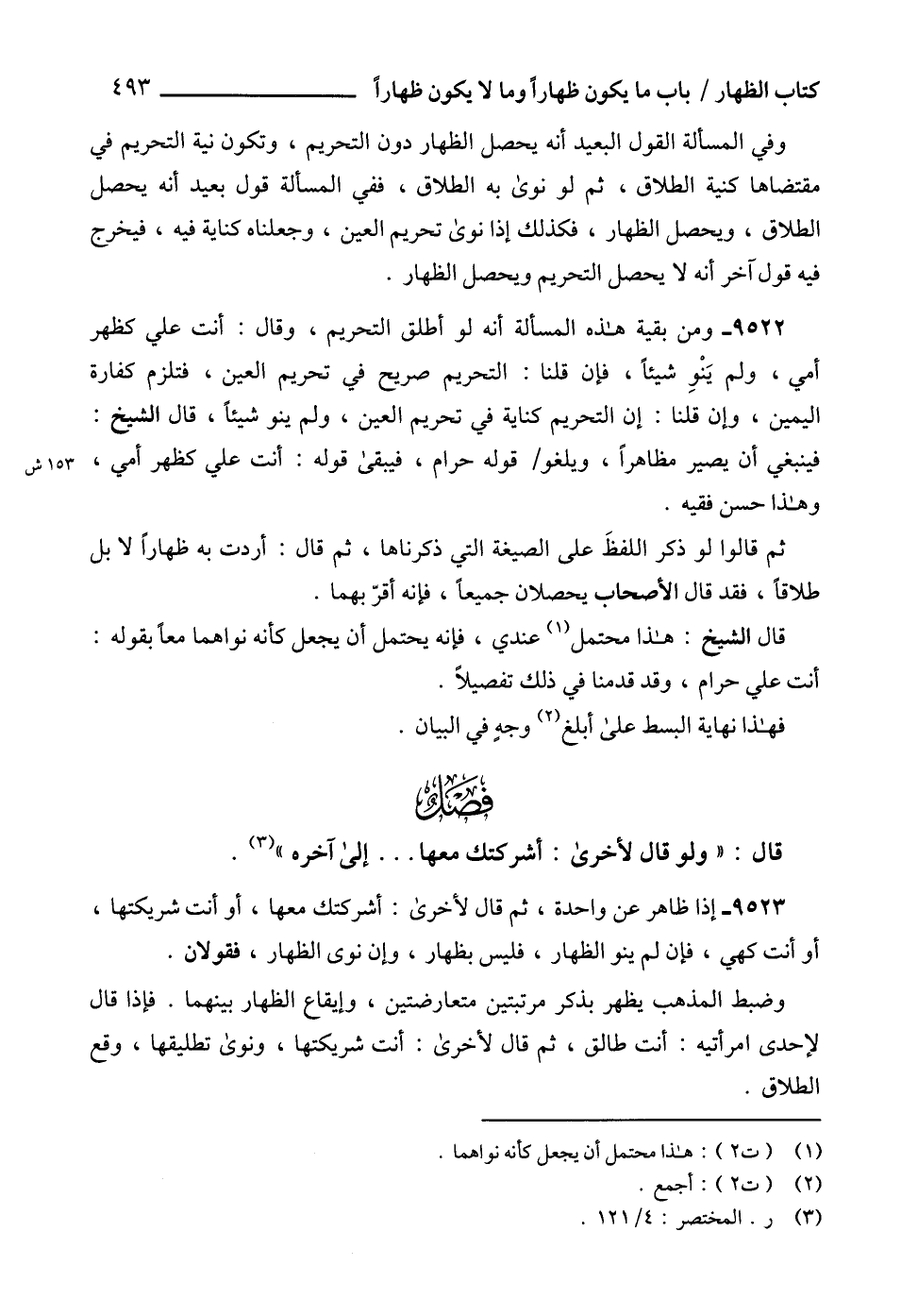 9522 - ومن بقية هذه المسألة أنه لو أطلق التحريم، وقال: أنت علي كظهر أمي، ولم يَنْوِ شيئاً، فإن قلنا: التحريم صريح في تحريم العين، فتلزم كفارة اليمين، وإن قلنا: إن التحريم كناية في تحريم العين، ولم ينو شيئاً، قال الشيخ: فينبغي أن يصير مظاهراً، ويلغو قوله حرام، فيبقى قوله: أنت علي كظهر أمي، وهذا حسن فقيه.