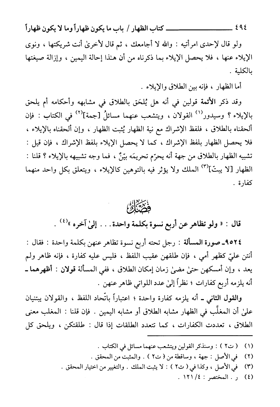 9524 - صورة المسألة: رجل تحته أربع نسوة تظاهر عنهن بكلمة واحدة: فقال: أنتن عليّ كظهر أمي، فإن طلقهن عقيب اللفظ، فليس عليه كفارة، فإنه ظاهر ولم يعد، وإن أمسكهن حتى مضى زمان إمكان الطلاق، ففي المسألة قولان: أظهرهما - أنه يلزمه أربع كفارات؛ نظراً إلى عدد اللواتي ظاهر عنهن.
