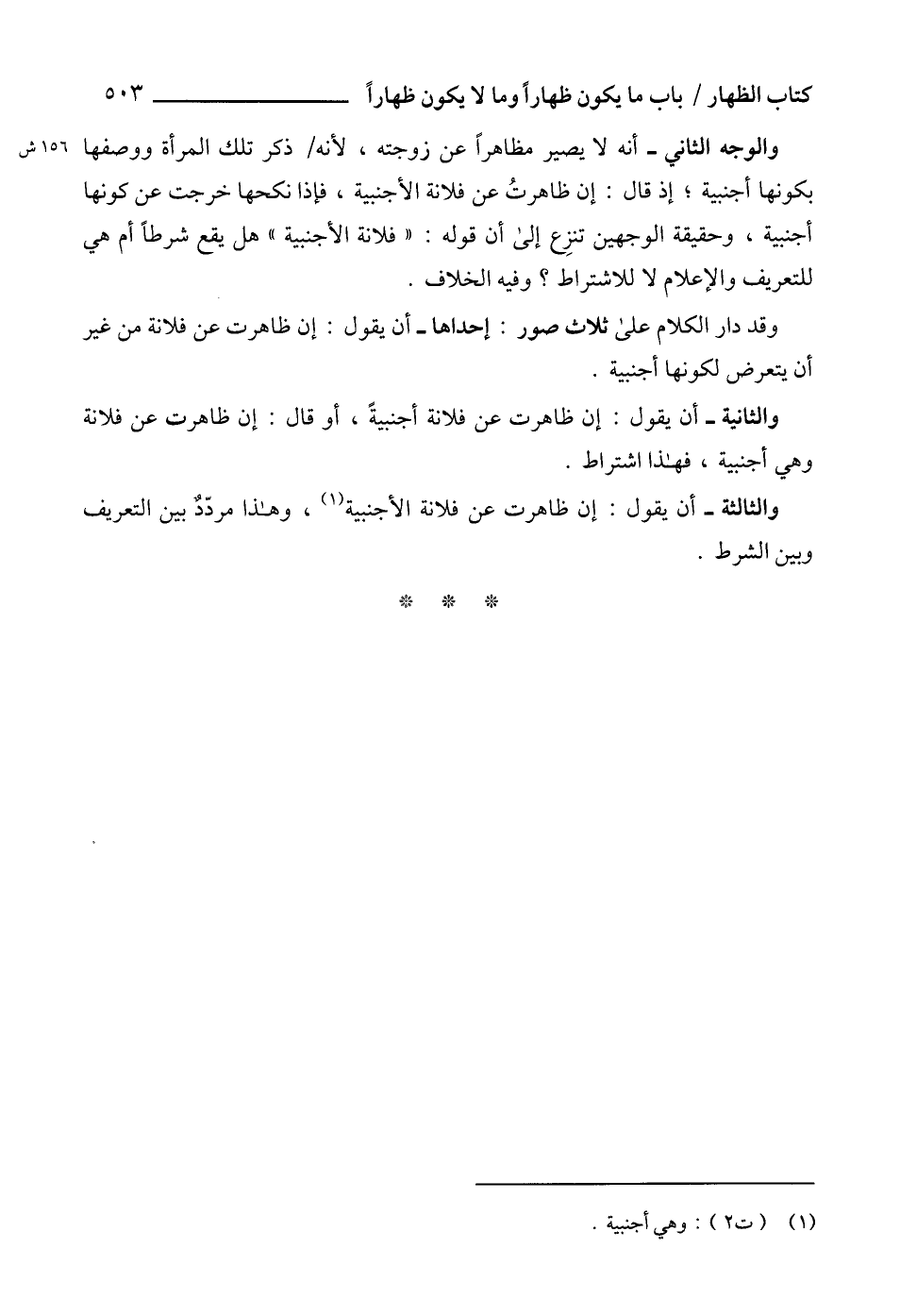 والثانية - أن يقول: إن ظاهرت عن فلانة أجنبيةً، أو قال: إن ظاهرت عن فلانة وهي أجنبية، فهذا اشتراط.